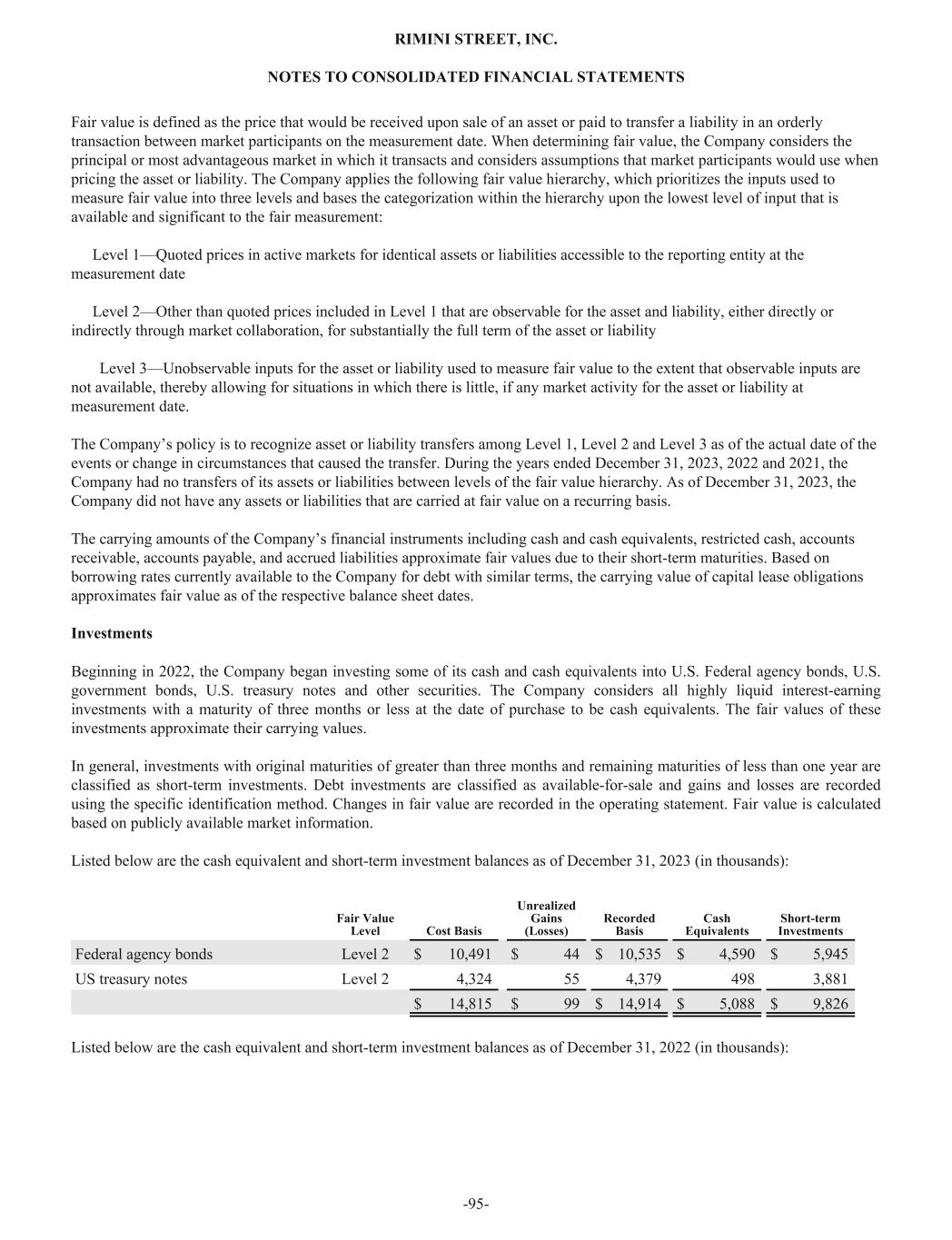 Fair value is defined as the price that would be received upon sale of an asset or paid to transfer a liability in an orderly transaction between market participants on the measurement date. When determining fair value, the Company considers the principal or most advantageous market in which it transacts and considers assumptions that market participants would use when pricing the asset or liability. The Company applies the following fair value hierarchy, which prioritizes the inputs used to measure fair value into three levels and bases the categorization within the hierarchy upon the lowest level of input that is available and significant to the fair measurement: Level 1—Quoted prices in active markets for identical assets or liabilities accessible to the reporting entity at the measurement date Level 2—Other than quoted prices included in Level 1 that are observable for the asset and liability, either directly or indirectly through market collaboration, for substantially the full term of the asset or liability Level 3—Unobservable inputs for the asset or liability used to measure fair value to the extent that observable inputs are not available, thereby allowing for situations in which there is little, if any market activity for the asset or liability at measurement date. The Company’s policy is to recognize asset or liability transfers among Level 1, Level 2 and Level 3 as of the actual date of the events or change in circumstances that caused the transfer. During the years ended December 31, 2023, 2022 and 2021, the Company had no transfers of its assets or liabilities between levels of the fair value hierarchy. As of December 31, 2023, the Company did not have any assets or liabilities that are carried at fair value on a recurring basis. The carrying amounts of the Company’s financial instruments including cash and cash equivalents, restricted cash, accounts receivable, accounts payable, and accrued liabilities approximate fair values due to their short-term maturities. Based on borrowing rates currently available to the Company for debt with similar terms, the carrying value of capital lease obligations approximates fair value as of the respective balance sheet dates. Investments Beginning in 2022, the Company began investing some of its cash and cash equivalents into U.S. Federal agency bonds, U.S. government bonds, U.S. treasury notes and other securities. The Company considers all highly liquid interest-earning investments with a maturity of three months or less at the date of purchase to be cash equivalents. The fair values of these investments approximate their carrying values. In general, investments with original maturities of greater than three months and remaining maturities of less than one year are classified as short-term investments. Debt investments are classified as available-for-sale and gains and losses are recorded using the specific identification method. Changes in fair value are recorded in the operating statement. Fair value is calculated based on publicly available market information. Listed below are the cash equivalent and short-term investment balances as of December 31, 2023 (in thousands): Fair Value Level Cost Basis Unrealized Gains (Losses) Recorded Basis Cash Equivalents Short-term Investments Federal agency bonds Level 2 $ 10,491 $ 44 $ 10,535 $ 4,590 $ 5,945 US treasury notes Level 2 4,324 55 4,379 498 3,881 $ 14,815 $ 99 $ 14,914 $ 5,088 $ 9,826 Listed below are the cash equivalent and short-term investment balances as of December 31, 2022 (in thousands): RIMINI STREET, INC. NOTES TO CONSOLIDATED FINANCIAL STATEMENTS -95-