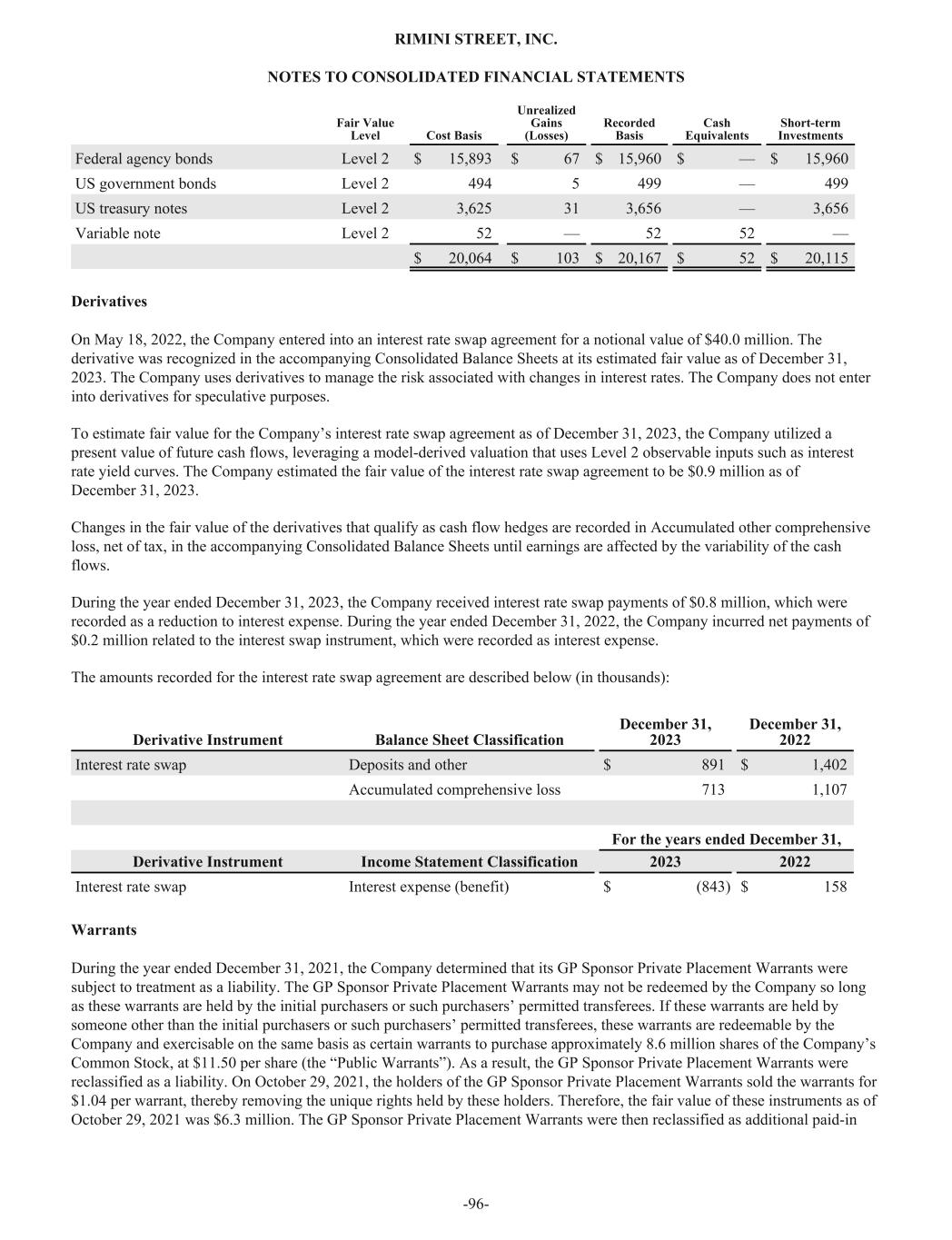 Fair Value Level Cost Basis Unrealized Gains (Losses) Recorded Basis Cash Equivalents Short-term Investments Federal agency bonds Level 2 $ 15,893 $ 67 $ 15,960 $ — $ 15,960 US government bonds Level 2 494 5 499 — 499 US treasury notes Level 2 3,625 31 3,656 — 3,656 Variable note Level 2 52 — 52 52 — $ 20,064 $ 103 $ 20,167 $ 52 $ 20,115 Derivatives On May 18, 2022, the Company entered into an interest rate swap agreement for a notional value of $40.0 million. The derivative was recognized in the accompanying Consolidated Balance Sheets at its estimated fair value as of December 31, 2023. The Company uses derivatives to manage the risk associated with changes in interest rates. The Company does not enter into derivatives for speculative purposes. To estimate fair value for the Company’s interest rate swap agreement as of December 31, 2023, the Company utilized a present value of future cash flows, leveraging a model-derived valuation that uses Level 2 observable inputs such as interest rate yield curves. The Company estimated the fair value of the interest rate swap agreement to be $0.9 million as of December 31, 2023. Changes in the fair value of the derivatives that qualify as cash flow hedges are recorded in Accumulated other comprehensive loss, net of tax, in the accompanying Consolidated Balance Sheets until earnings are affected by the variability of the cash flows. During the year ended December 31, 2023, the Company received interest rate swap payments of $0.8 million, which were recorded as a reduction to interest expense. During the year ended December 31, 2022, the Company incurred net payments of $0.2 million related to the interest swap instrument, which were recorded as interest expense. The amounts recorded for the interest rate swap agreement are described below (in thousands): Derivative Instrument Balance Sheet Classification December 31, 2023 December 31, 2022 Interest rate swap Deposits and other $ 891 $ 1,402 Accumulated comprehensive loss 713 1,107 For the years ended December 31, Derivative Instrument Income Statement Classification 2023 2022 Interest rate swap Interest expense (benefit) $ (843) $ 158 Warrants During the year ended December 31, 2021, the Company determined that its GP Sponsor Private Placement Warrants were subject to treatment as a liability. The GP Sponsor Private Placement Warrants may not be redeemed by the Company so long as these warrants are held by the initial purchasers or such purchasers’ permitted transferees. If these warrants are held by someone other than the initial purchasers or such purchasers’ permitted transferees, these warrants are redeemable by the Company and exercisable on the same basis as certain warrants to purchase approximately 8.6 million shares of the Company’s Common Stock, at $11.50 per share (the “Public Warrants”). As a result, the GP Sponsor Private Placement Warrants were reclassified as a liability. On October 29, 2021, the holders of the GP Sponsor Private Placement Warrants sold the warrants for $1.04 per warrant, thereby removing the unique rights held by these holders. Therefore, the fair value of these instruments as of October 29, 2021 was $6.3 million. The GP Sponsor Private Placement Warrants were then reclassified as additional paid-in RIMINI STREET, INC. NOTES TO CONSOLIDATED FINANCIAL STATEMENTS -96-