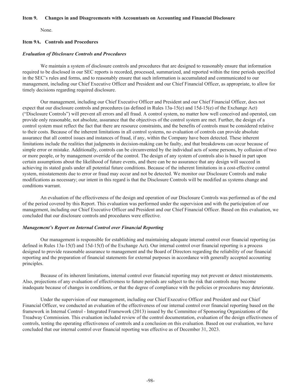 Item 9. Changes in and Disagreements with Accountants on Accounting and Financial Disclosure None. Item 9A. Controls and Procedures Evaluation of Disclosure Controls and Procedures We maintain a system of disclosure controls and procedures that are designed to reasonably ensure that information required to be disclosed in our SEC reports is recorded, processed, summarized, and reported within the time periods specified in the SEC’s rules and forms, and to reasonably ensure that such information is accumulated and communicated to our management, including our Chief Executive Officer and President and our Chief Financial Officer, as appropriate, to allow for timely decisions regarding required disclosure. Our management, including our Chief Executive Officer and President and our Chief Financial Officer, does not expect that our disclosure controls and procedures (as defined in Rules 13a-15(e) and 15d-15(e) of the Exchange Act) (“Disclosure Controls”) will prevent all errors and all fraud. A control system, no matter how well conceived and operated, can provide only reasonable, not absolute, assurance that the objectives of the control system are met. Further, the design of a control system must reflect the fact that there are resource constraints, and the benefits of controls must be considered relative to their costs. Because of the inherent limitations in all control systems, no evaluation of controls can provide absolute assurance that all control issues and instances of fraud, if any, within the Company have been detected. These inherent limitations include the realities that judgments in decision-making can be faulty, and that breakdowns can occur because of simple error or mistake. Additionally, controls can be circumvented by the individual acts of some persons, by collusion of two or more people, or by management override of the control. The design of any system of controls also is based in part upon certain assumptions about the likelihood of future events, and there can be no assurance that any design will succeed in achieving its stated goals under all potential future conditions. Because of the inherent limitations in a cost-effective control system, misstatements due to error or fraud may occur and not be detected. We monitor our Disclosure Controls and make modifications as necessary; our intent in this regard is that the Disclosure Controls will be modified as systems change and conditions warrant. An evaluation of the effectiveness of the design and operation of our Disclosure Controls was performed as of the end of the period covered by this Report. This evaluation was performed under the supervision and with the participation of our management, including our Chief Executive Officer and President and our Chief Financial Officer. Based on this evaluation, we concluded that our disclosure controls and procedures were effective. Management’s Report on Internal Control over Financial Reporting Our management is responsible for establishing and maintaining adequate internal control over financial reporting (as defined in Rules 13a-15(f) and 15d-15(f) of the Exchange Act). Our internal control over financial reporting is a process designed to provide reasonable assurance to management and the Board of Directors regarding the reliability of our financial reporting and the preparation of financial statements for external purposes in accordance with generally accepted accounting principles. Because of its inherent limitations, internal control over financial reporting may not prevent or detect misstatements. Also, projections of any evaluation of effectiveness to future periods are subject to the risk that controls may become inadequate because of changes in conditions, or that the degree of compliance with the policies or procedures may deteriorate. Under the supervision of our management, including our Chief Executive Officer and President and our Chief Financial Officer, we conducted an evaluation of the effectiveness of our internal control over financial reporting based on the framework in Internal Control - Integrated Framework (2013) issued by the Committee of Sponsoring Organizations of the Treadway Commission. This evaluation included review of the control documentation, evaluation of the design effectiveness of controls, testing the operating effectiveness of controls and a conclusion on this evaluation. Based on our evaluation, we have concluded that our internal control over financial reporting was effective as of December 31, 2023. -98-