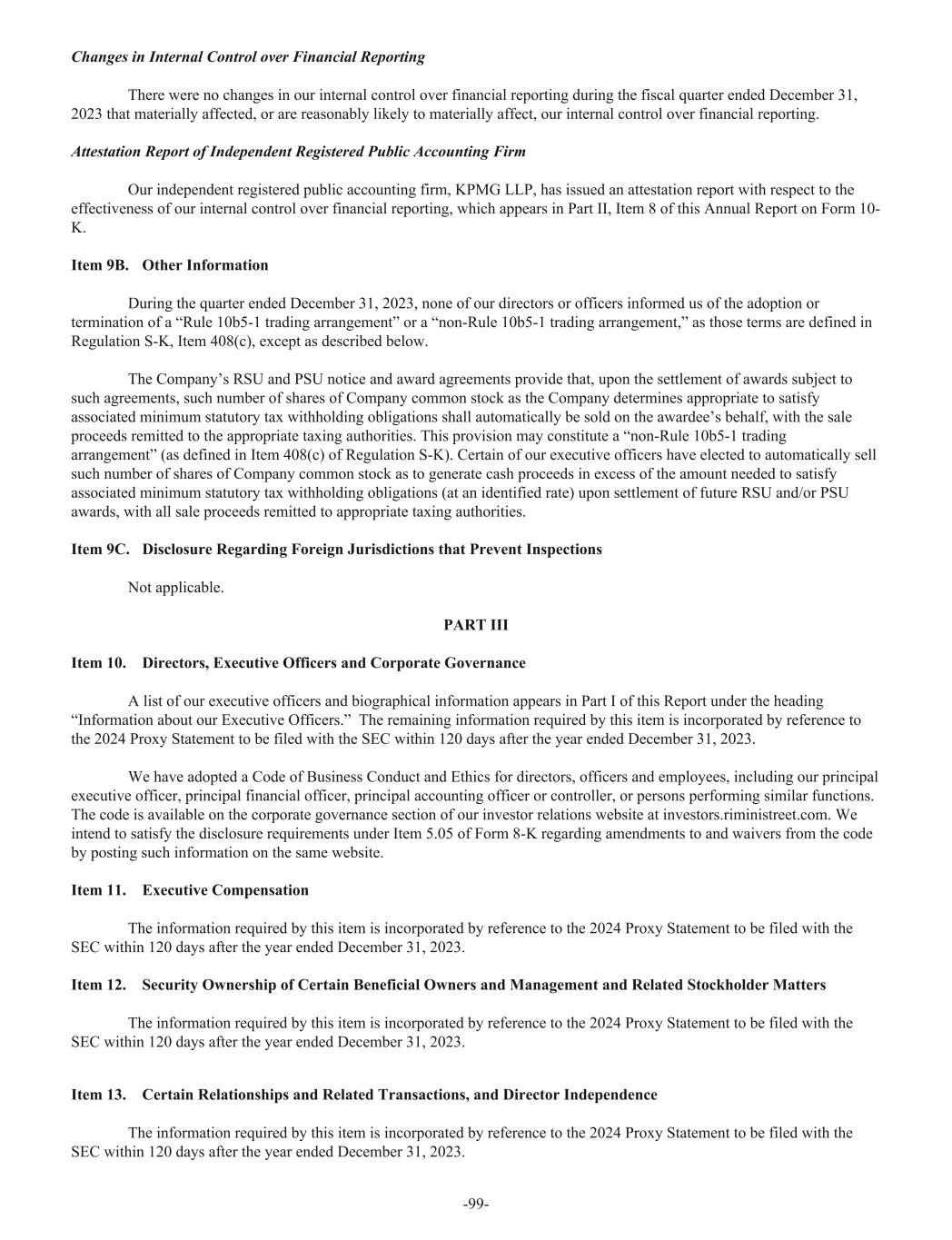 Changes in Internal Control over Financial Reporting There were no changes in our internal control over financial reporting during the fiscal quarter ended December 31, 2023 that materially affected, or are reasonably likely to materially affect, our internal control over financial reporting. Attestation Report of Independent Registered Public Accounting Firm Our independent registered public accounting firm, KPMG LLP, has issued an attestation report with respect to the effectiveness of our internal control over financial reporting, which appears in Part II, Item 8 of this Annual Report on Form 10- K. Item 9B. Other Information During the quarter ended December 31, 2023, none of our directors or officers informed us of the adoption or termination of a “Rule 10b5-1 trading arrangement” or a “non-Rule 10b5-1 trading arrangement,” as those terms are defined in Regulation S-K, Item 408(c), except as described below. The Company’s RSU and PSU notice and award agreements provide that, upon the settlement of awards subject to such agreements, such number of shares of Company common stock as the Company determines appropriate to satisfy associated minimum statutory tax withholding obligations shall automatically be sold on the awardee’s behalf, with the sale proceeds remitted to the appropriate taxing authorities. This provision may constitute a “non-Rule 10b5-1 trading arrangement” (as defined in Item 408(c) of Regulation S-K). Certain of our executive officers have elected to automatically sell such number of shares of Company common stock as to generate cash proceeds in excess of the amount needed to satisfy associated minimum statutory tax withholding obligations (at an identified rate) upon settlement of future RSU and/or PSU awards, with all sale proceeds remitted to appropriate taxing authorities. Item 9C. Disclosure Regarding Foreign Jurisdictions that Prevent Inspections Not applicable. PART III Item 10. Directors, Executive Officers and Corporate Governance A list of our executive officers and biographical information appears in Part I of this Report under the heading “Information about our Executive Officers.” The remaining information required by this item is incorporated by reference to the 2024 Proxy Statement to be filed with the SEC within 120 days after the year ended December 31, 2023. We have adopted a Code of Business Conduct and Ethics for directors, officers and employees, including our principal executive officer, principal financial officer, principal accounting officer or controller, or persons performing similar functions. The code is available on the corporate governance section of our investor relations website at investors.riministreet.com. We intend to satisfy the disclosure requirements under Item 5.05 of Form 8-K regarding amendments to and waivers from the code by posting such information on the same website. Item 11. Executive Compensation The information required by this item is incorporated by reference to the 2024 Proxy Statement to be filed with the SEC within 120 days after the year ended December 31, 2023. Item 12. Security Ownership of Certain Beneficial Owners and Management and Related Stockholder Matters The information required by this item is incorporated by reference to the 2024 Proxy Statement to be filed with the SEC within 120 days after the year ended December 31, 2023. Item 13. Certain Relationships and Related Transactions, and Director Independence The information required by this item is incorporated by reference to the 2024 Proxy Statement to be filed with the SEC within 120 days after the year ended December 31, 2023. -99-