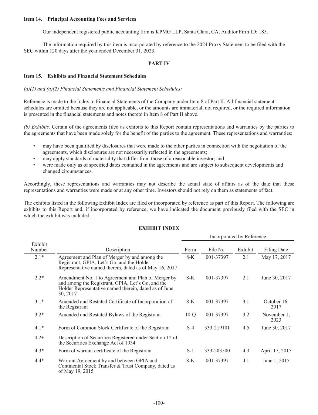 Item 14. Principal Accounting Fees and Services Our independent registered public accounting firm is KPMG LLP, Santa Clara, CA, Auditor Firm ID: 185. The information required by this item is incorporated by reference to the 2024 Proxy Statement to be filed with the SEC within 120 days after the year ended December 31, 2023. PART IV Item 15. Exhibits and Financial Statement Schedules (a)(1) and (a)(2) Financial Statements and Financial Statement Schedules: Reference is made to the Index to Financial Statements of the Company under Item 8 of Part II. All financial statement schedules are omitted because they are not applicable, or the amounts are immaterial, not required, or the required information is presented in the financial statements and notes thereto in Item 8 of Part II above. (b) Exhibits. Certain of the agreements filed as exhibits to this Report contain representations and warranties by the parties to the agreements that have been made solely for the benefit of the parties to the agreement. These representations and warranties: • may have been qualified by disclosures that were made to the other parties in connection with the negotiation of the agreements, which disclosures are not necessarily reflected in the agreements; • may apply standards of materiality that differ from those of a reasonable investor; and • were made only as of specified dates contained in the agreements and are subject to subsequent developments and changed circumstances. Accordingly, these representations and warranties may not describe the actual state of affairs as of the date that these representations and warranties were made or at any other time. Investors should not rely on them as statements of fact. The exhibits listed in the following Exhibit Index are filed or incorporated by reference as part of this Report. The following are exhibits to this Report and, if incorporated by reference, we have indicated the document previously filed with the SEC in which the exhibit was included. EXHIBIT INDEX Incorporated by Reference Exhibit Number Description Form File No. Exhibit Filing Date 2.1* Agreement and Plan of Merger by and among the Registrant, GPIA, Let’s Go, and the Holder Representative named therein, dated as of May 16, 2017 8-K 001-37397 2.1 May 17, 2017 2.2* Amendment No. 1 to Agreement and Plan of Merger by and among the Registrant, GPIA, Let’s Go, and the Holder Representative named therein, dated as of June 30, 2017 8-K 001-37397 2.1 June 30, 2017 3.1* Amended and Restated Certificate of Incorporation of the Registrant 8-K 001-37397 3.1 October 16, 2017 3.2* Amended and Restated Bylaws of the Registrant 10-Q 001-37397 3.2 November 1, 2023 4.1* Form of Common Stock Certificate of the Registrant S-4 333-219101 4.5 June 30, 2017 4.2+ Description of Securities Registered under Section 12 of the Securities Exchange Act of 1934 4.3* Form of warrant certificate of the Registrant S-1 333-203500 4.3 April 17, 2015 4.4* Warrant Agreement by and between GPIA and Continental Stock Transfer & Trust Company, dated as of May 19, 2015 8-K 001-37397 4.1 June 1, 2015 -100-