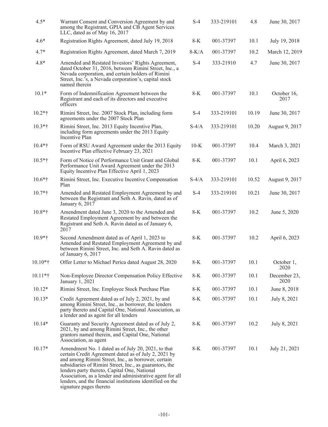 4.5* Warrant Consent and Conversion Agreement by and among the Registrant, GPIA and CB Agent Services LLC, dated as of May 16, 2017 S-4 333-219101 4.8 June 30, 2017 4.6* Registration Rights Agreement, dated July 19, 2018 8-K 001-37397 10.1 July 19, 2018 4.7* Registration Rights Agreement, dated March 7, 2019 8-K/A 001-37397 10.2 March 12, 2019 4.8* Amended and Restated Investors’ Rights Agreement, dated October 31, 2016, between Rimini Street, Inc., a Nevada corporation, and certain holders of Rimini Street, Inc.’s, a Nevada corporation’s, capital stock named therein S-4 333-21910 4.7 June 30, 2017 10.1* Form of Indemnification Agreement between the Registrant and each of its directors and executive officers 8-K 001-37397 10.1 October 16, 2017 10.2*† Rimini Street, Inc. 2007 Stock Plan, including form agreements under the 2007 Stock Plan S-4 333-219101 10.19 June 30, 2017 10.3*† Rimini Street, Inc. 2013 Equity Incentive Plan, including form agreements under the 2013 Equity Incentive Plan S-4/A 333-219101 10.20 August 9, 2017 10.4*† Form of RSU Award Agreement under the 2013 Equity Incentive Plan effective February 23, 2021 10-K 001-37397 10.4 March 3, 2021 10.5*† Form of Notice of Performance Unit Grant and Global Performance Unit Award Agreement under the 2013 Equity Incentive Plan Effective April 1, 2023 8-K 001-37397 10.1 April 6, 2023 10.6*† Rimini Street, Inc. Executive Incentive Compensation Plan S-4/A 333-219101 10.52 August 9, 2017 10.7*† Amended and Restated Employment Agreement by and between the Registrant and Seth A. Ravin, dated as of January 6, 2017 S-4 333-219101 10.21 June 30, 2017 10.8*† Amendment dated June 3, 2020 to the Amended and Restated Employment Agreement by and between the Registrant and Seth A. Ravin dated as of January 6, 2017 8-K 001-37397 10.2 June 5, 2020 10.9*† Second Amendment dated as of April 1, 2023 to Amended and Restated Employment Agreement by and between Rimini Street, Inc. and Seth A. Ravin dated as of January 6, 2017 8-K 001-37397 10.2 April 6, 2023 10.10*† Offer Letter to Michael Perica dated August 28, 2020 8-K 001-37397 10.1 October 1, 2020 10.11*† Non-Employee Director Compensation Policy Effective January 1, 2021 8-K 001-37397 10.1 December 23, 2020 10.12* Rimini Street, Inc. Employee Stock Purchase Plan 8-K 001-37397 10.1 June 8, 2018 10.13* Credit Agreement dated as of July 2, 2021, by and among Rimini Street, Inc., as borrower, the lenders party thereto and Capital One, National Association, as a lender and as agent for all lenders 8-K 001-37397 10.1 July 8, 2021 10.14* Guaranty and Security Agreement dated as of July 2, 2021, by and among Rimini Street, Inc., the other grantors named therein, and Capital One, National Association, as agent 8-K 001-37397 10.2 July 8, 2021 10.17* Amendment No. 1 dated as of July 20, 2021, to that certain Credit Agreement dated as of July 2, 2021 by and among Rimini Street, Inc., as borrower, certain subsidiaries of Rimini Street, Inc., as guarantors, the lenders party thereto, Capital One, National Association, as a lender and administrative agent for all lenders, and the financial institutions identified on the signature pages thereto 8-K 001-37397 10.1 July 21, 2021 -101-