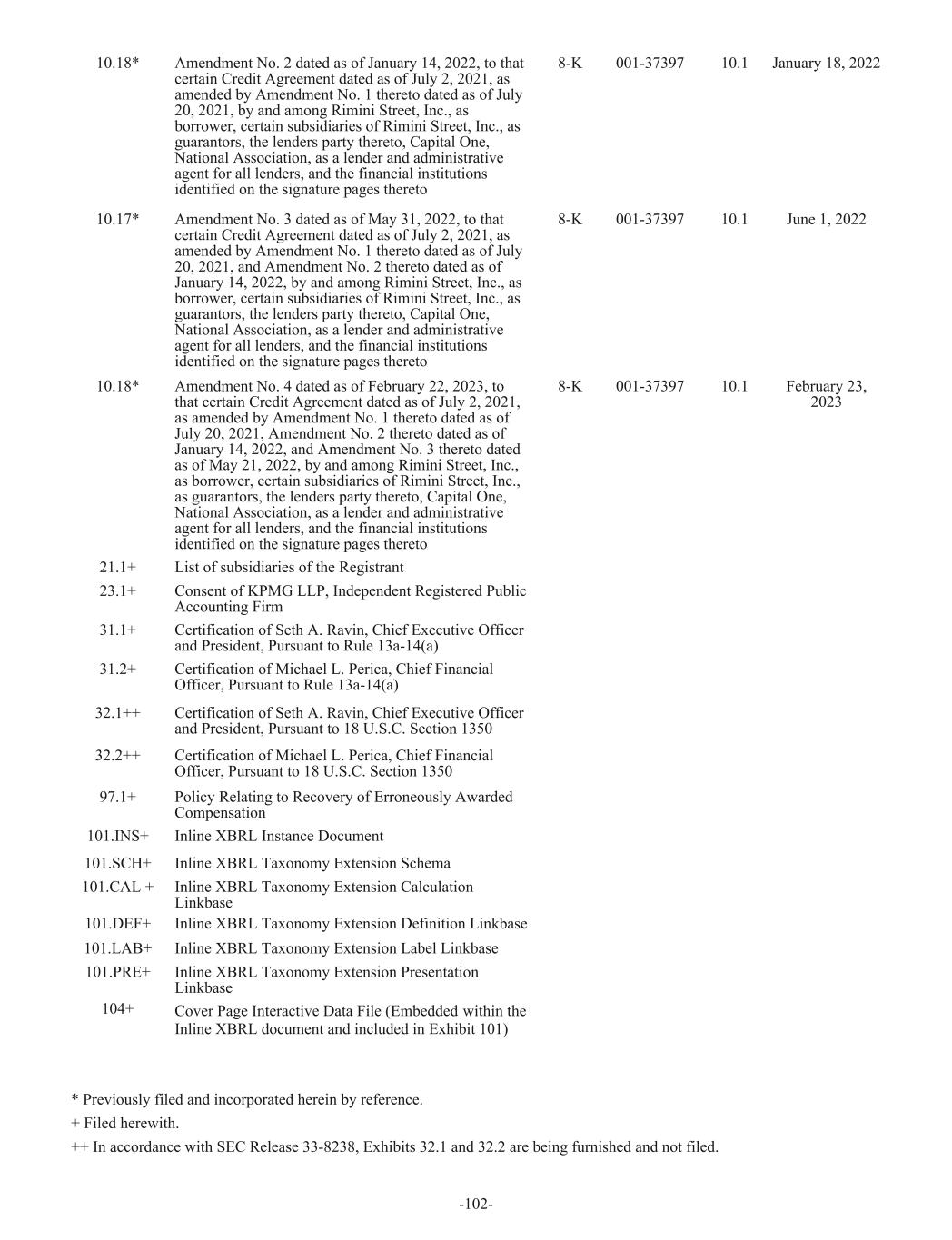 10.18* Amendment No. 2 dated as of January 14, 2022, to that certain Credit Agreement dated as of July 2, 2021, as amended by Amendment No. 1 thereto dated as of July 20, 2021, by and among Rimini Street, Inc., as borrower, certain subsidiaries of Rimini Street, Inc., as guarantors, the lenders party thereto, Capital One, National Association, as a lender and administrative agent for all lenders, and the financial institutions identified on the signature pages thereto 8-K 001-37397 10.1 January 18, 2022 10.17* Amendment No. 3 dated as of May 31, 2022, to that certain Credit Agreement dated as of July 2, 2021, as amended by Amendment No. 1 thereto dated as of July 20, 2021, and Amendment No. 2 thereto dated as of January 14, 2022, by and among Rimini Street, Inc., as borrower, certain subsidiaries of Rimini Street, Inc., as guarantors, the lenders party thereto, Capital One, National Association, as a lender and administrative agent for all lenders, and the financial institutions identified on the signature pages thereto 8-K 001-37397 10.1 June 1, 2022 10.18* Amendment No. 4 dated as of February 22, 2023, to that certain Credit Agreement dated as of July 2, 2021, as amended by Amendment No. 1 thereto dated as of July 20, 2021, Amendment No. 2 thereto dated as of January 14, 2022, and Amendment No. 3 thereto dated as of May 21, 2022, by and among Rimini Street, Inc., as borrower, certain subsidiaries of Rimini Street, Inc., as guarantors, the lenders party thereto, Capital One, National Association, as a lender and administrative agent for all lenders, and the financial institutions identified on the signature pages thereto 8-K 001-37397 10.1 February 23, 2023 21.1+ List of subsidiaries of the Registrant 23.1+ Consent of KPMG LLP, Independent Registered Public Accounting Firm 31.1+ Certification of Seth A. Ravin, Chief Executive Officer and President, Pursuant to Rule 13a-14(a) 31.2+ Certification of Michael L. Perica, Chief Financial Officer, Pursuant to Rule 13a-14(a) 32.1++ Certification of Seth A. Ravin, Chief Executive Officer and President, Pursuant to 18 U.S.C. Section 1350 32.2++ Certification of Michael L. Perica, Chief Financial Officer, Pursuant to 18 U.S.C. Section 1350 97.1+ Policy Relating to Recovery of Erroneously Awarded Compensation 101.INS+ Inline XBRL Instance Document 101.SCH+ Inline XBRL Taxonomy Extension Schema 101.CAL + Inline XBRL Taxonomy Extension Calculation Linkbase 101.DEF+ Inline XBRL Taxonomy Extension Definition Linkbase 101.LAB+ Inline XBRL Taxonomy Extension Label Linkbase 101.PRE+ Inline XBRL Taxonomy Extension Presentation Linkbase 104+ Cover Page Interactive Data File (Embedded within the Inline XBRL document and included in Exhibit 101) * Previously filed and incorporated herein by reference. + Filed herewith. ++ In accordance with SEC Release 33-8238, Exhibits 32.1 and 32.2 are being furnished and not filed. -102-