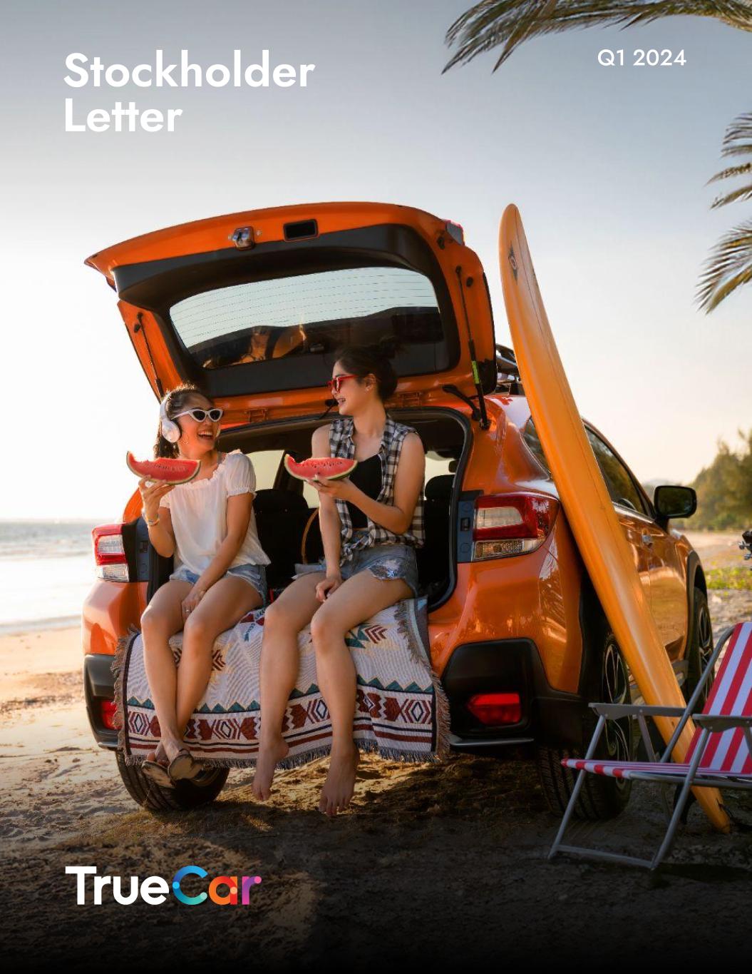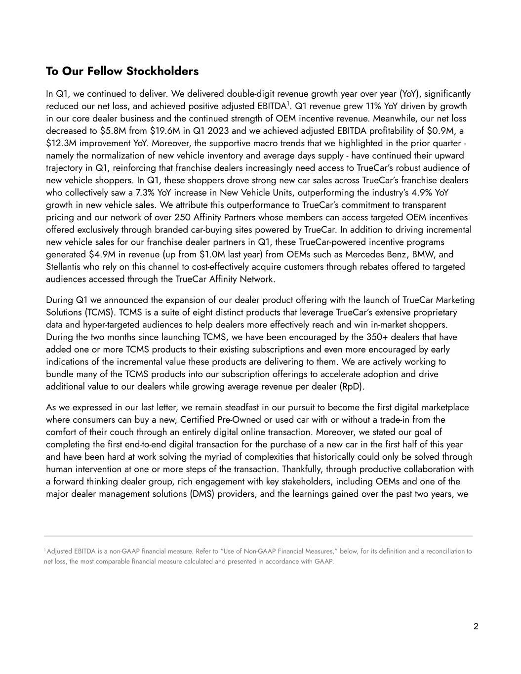 To Our Fellow Stockholders In Q1, we continued to deliver. We delivered double-digit revenue growth year over year (YoY), significantly reduced our net loss, and achieved positive adjusted EBITDA1. Q1 revenue grew 11% YoY driven by growth in our core dealer business and the continued strength of OEM incentive revenue. Meanwhile, our net loss decreased to $5.8M from $19.6M in Q1 2023 and we achieved adjusted EBITDA profitability of $0.9M, a $12.3M improvement YoY. Moreover, the supportive macro trends that we highlighted in the prior quarter - namely the normalization of new vehicle inventory and average days supply - have continued their upward trajectory in Q1, reinforcing that franchise dealers increasingly need access to TrueCar’s robust audience of new vehicle shoppers. In Q1, these shoppers drove strong new car sales across TrueCar’s franchise dealers who collectively saw a 7.3% YoY increase in New Vehicle Units, outperforming the industry’s 4.9% YoY growth in new vehicle sales. We attribute this outperformance to TrueCar’s commitment to transparent pricing and our network of over 250 Affinity Partners whose members can access targeted OEM incentives offered exclusively through branded car-buying sites powered by TrueCar. In addition to driving incremental new vehicle sales for our franchise dealer partners in Q1, these TrueCar-powered incentive programs generated $4.9M in revenue (up from $1.0M last year) from OEMs such as Mercedes Benz, BMW, and Stellantis who rely on this channel to cost-effectively acquire customers through rebates offered to targeted audiences accessed through the TrueCar Affinity Network. During Q1 we announced the expansion of our dealer product offering with the launch of TrueCar Marketing Solutions (TCMS). TCMS is a suite of eight distinct products that leverage TrueCar’s extensive proprietary data and hyper-targeted audiences to help dealers more effectively reach and win in-market shoppers. During the two months since launching TCMS, we have been encouraged by the 350+ dealers that have added one or more TCMS products to their existing subscriptions and even more encouraged by early indications of the incremental value these products are delivering to them. We are actively working to bundle many of the TCMS products into our subscription offerings to accelerate adoption and drive additional value to our dealers while growing average revenue per dealer (RpD). As we expressed in our last letter, we remain steadfast in our pursuit to become the first digital marketplace where consumers can buy a new, Certified Pre-Owned or used car with or without a trade-in from the comfort of their couch through an entirely digital online transaction. Moreover, we stated our goal of completing the first end-to-end digital transaction for the purchase of a new car in the first half of this year and have been hard at work solving the myriad of complexities that historically could only be solved through human intervention at one or more steps of the transaction. Thankfully, through productive collaboration with a forward thinking dealer group, rich engagement with key stakeholders, including OEMs and one of the major dealer management solutions (DMS) providers, and the learnings gained over the past two years, we 2 1 Adjusted EBITDA is a non-GAAP financial measure. Refer to “Use of Non-GAAP Financial Measures,” below, for its definition and a reconciliation to net loss, the most comparable financial measure calculated and presented in accordance with GAAP.