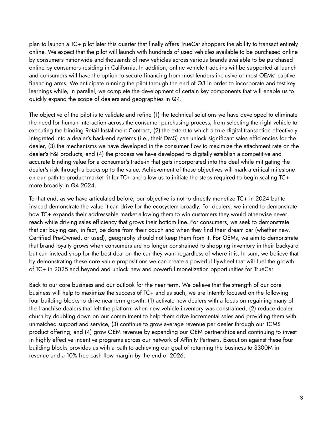 plan to launch a TC+ pilot later this quarter that finally offers TrueCar shoppers the ability to transact entirely online. We expect that the pilot will launch with hundreds of used vehicles available to be purchased online by consumers nationwide and thousands of new vehicles across various brands available to be purchased online by consumers residing in California. In addition, online vehicle trade-ins will be supported at launch and consumers will have the option to secure financing from most lenders inclusive of most OEMs’ captive financing arms. We anticipate running the pilot through the end of Q3 in order to incorporate and test key learnings while, in parallel, we complete the development of certain key components that will enable us to quickly expand the scope of dealers and geographies in Q4. The objective of the pilot is to validate and refine (1) the technical solutions we have developed to eliminate the need for human interaction across the consumer purchasing process, from selecting the right vehicle to executing the binding Retail Installment Contract, (2) the extent to which a true digital transaction effectively integrated into a dealer’s back-end systems (i.e., their DMS) can unlock significant sales efficiencies for the dealer, (3) the mechanisms we have developed in the consumer flow to maximize the attachment rate on the dealer’s F&I products, and (4) the process we have developed to digitally establish a competitive and accurate binding value for a consumer’s trade-in that gets incorporated into the deal while mitigating the dealer’s risk through a backstop to the value. Achievement of these objectives will mark a critical milestone on our path to product-market fit for TC+ and allow us to initiate the steps required to begin scaling TC+ more broadly in Q4 2024. To that end, as we have articulated before, our objective is not to directly monetize TC+ in 2024 but to instead demonstrate the value it can drive for the ecosystem broadly. For dealers, we intend to demonstrate how TC+ expands their addressable market allowing them to win customers they would otherwise never reach while driving sales efficiency that grows their bottom line. For consumers, we seek to demonstrate that car buying can, in fact, be done from their couch and when they find their dream car (whether new, Certified Pre-Owned, or used), geography should not keep them from it. For OEMs, we aim to demonstrate that brand loyalty grows when consumers are no longer constrained to shopping inventory in their backyard but can instead shop for the best deal on the car they want regardless of where it is. In sum, we believe that by demonstrating these core value propositions we can create a powerful flywheel that will fuel the growth of TC+ in 2025 and beyond and unlock new and powerful monetization opportunities for TrueCar. Back to our core business and our outlook for the near term. We believe that the strength of our core business will help to maximize the success of TC+ and as such, we are intently focused on the following four building blocks to drive near-term growth: (1) activate new dealers with a focus on regaining many of the franchise dealers that left the platform when new vehicle inventory was constrained, (2) reduce dealer churn by doubling down on our commitment to help them drive incremental sales and providing them with unmatched support and service, (3) continue to grow average revenue per dealer through our TCMS product offering, and (4) grow OEM revenue by expanding our OEM partnerships and continuing to invest in highly effective incentive programs across our network of Affinity Partners. Execution against these four building blocks provides us with a path to achieving our goal of returning the business to $300M in revenue and a 10% free cash flow margin by the end of 2026. 3