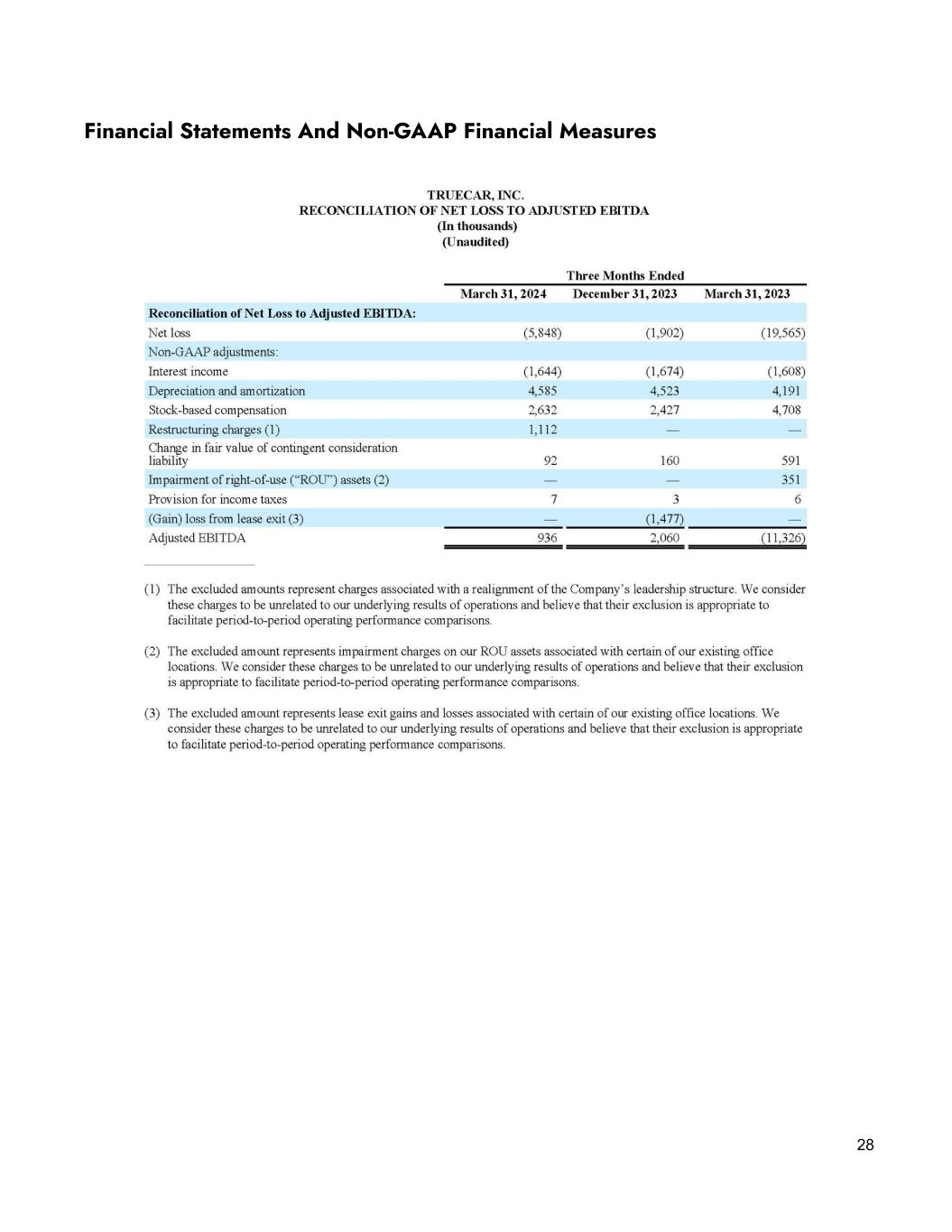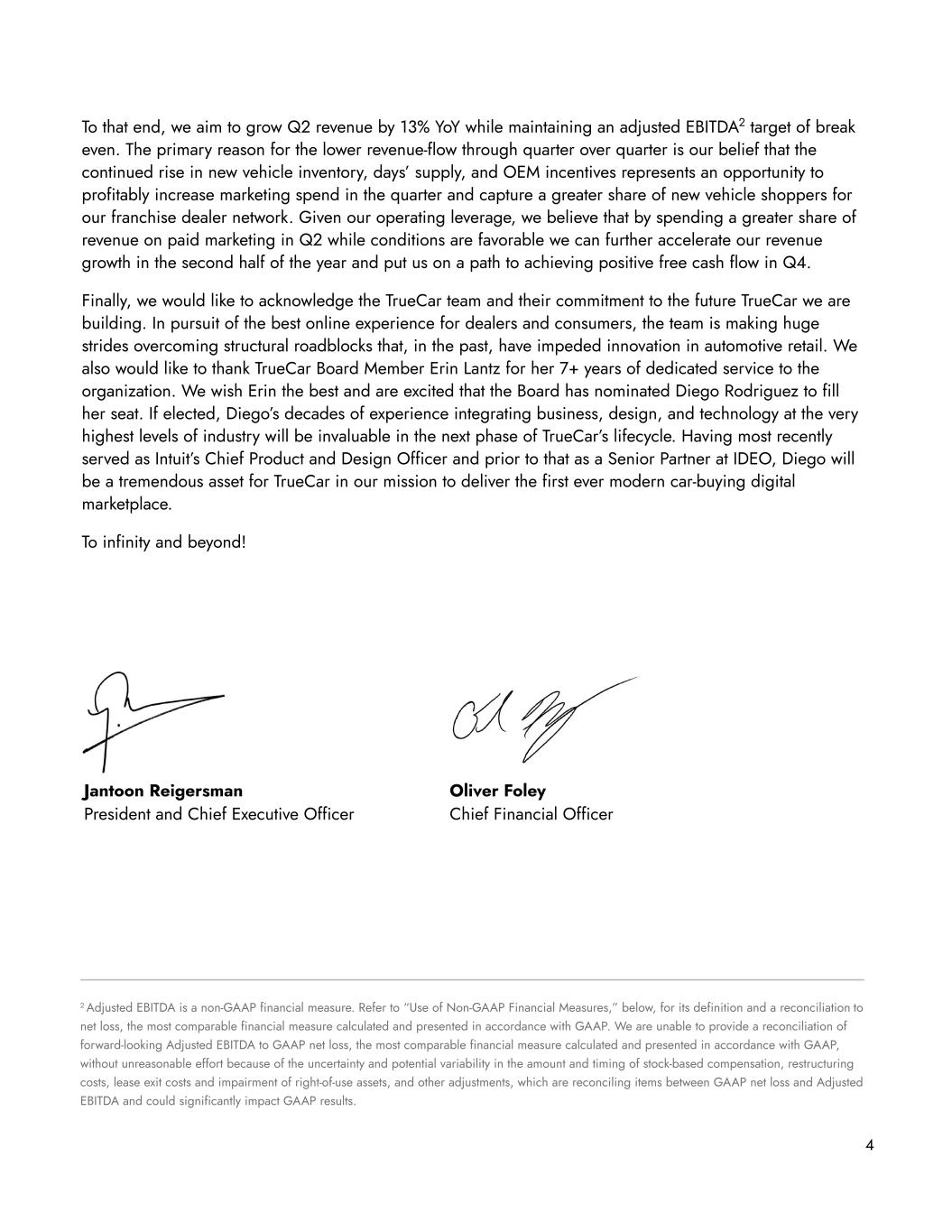 To that end, we aim to grow Q2 revenue by 13% YoY while maintaining an adjusted EBITDA2 target of break even. The primary reason for the lower revenue-flow through quarter over quarter is our belief that the continued rise in new vehicle inventory, days’ supply, and OEM incentives represents an opportunity to profitably increase marketing spend in the quarter and capture a greater share of new vehicle shoppers for our franchise dealer network. Given our operating leverage, we believe that by spending a greater share of revenue on paid marketing in Q2 while conditions are favorable we can further accelerate our revenue growth in the second half of the year and put us on a path to achieving positive free cash flow in Q4. Finally, we would like to acknowledge the TrueCar team and their commitment to the future TrueCar we are building. In pursuit of the best online experience for dealers and consumers, the team is making huge strides overcoming structural roadblocks that, in the past, have impeded innovation in automotive retail. We also would like to thank TrueCar Board Member Erin Lantz for her 7+ years of dedicated service to the organization. We wish Erin the best and are excited that the Board has nominated Diego Rodriguez to fill her seat. If elected, Diego’s decades of experience integrating business, design, and technology at the very highest levels of industry will be invaluable in the next phase of TrueCar’s lifecycle. Having most recently served as Intuit’s Chief Product and Design Officer and prior to that as a Senior Partner at IDEO, Diego will be a tremendous asset for TrueCar in our mission to deliver the first ever modern car-buying digital marketplace. To infinity and beyond! 4 Jantoon Reigersman President and Chief Executive Officer Oliver Foley Chief Financial Officer 2 Adjusted EBITDA is a non-GAAP financial measure. Refer to “Use of Non-GAAP Financial Measures,” below, for its definition and a reconciliation to net loss, the most comparable financial measure calculated and presented in accordance with GAAP. We are unable to provide a reconciliation of forward-looking Adjusted EBITDA to GAAP net loss, the most comparable financial measure calculated and presented in accordance with GAAP, without unreasonable effort because of the uncertainty and potential variability in the amount and timing of stock-based compensation, restructuring costs, lease exit costs and impairment of right-of-use assets, and other adjustments, which are reconciling items between GAAP net loss and Adjusted EBITDA and could significantly impact GAAP results.