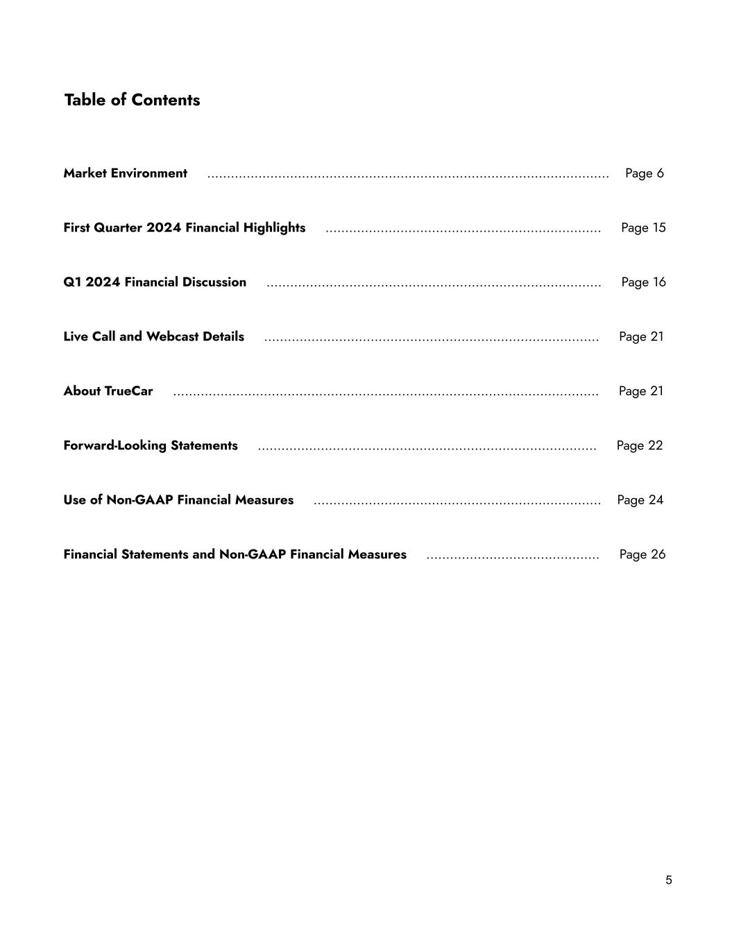 Table of Contents Market Environment ……………………………………………..……………………………..………..… Page 6 First Quarter 2024 Financial Highlights …………………….…………….……………………..… Page 15 Q1 2024 Financial Discussion …………………………………………………….………..…..…..… Page 16 Live Call and Webcast Details ……………….………………………………………….…………..… Page 21 About TrueCar …………………………………………………………………………………...….…..… Page 21 Forward-Looking Statements …………………………………………….……….………….……..… Page 22 Use of Non-GAAP Financial Measures ………………………………………….….……………..… Page 24 Financial Statements and Non-GAAP Financial Measures ……………………………..……… Page 26 5