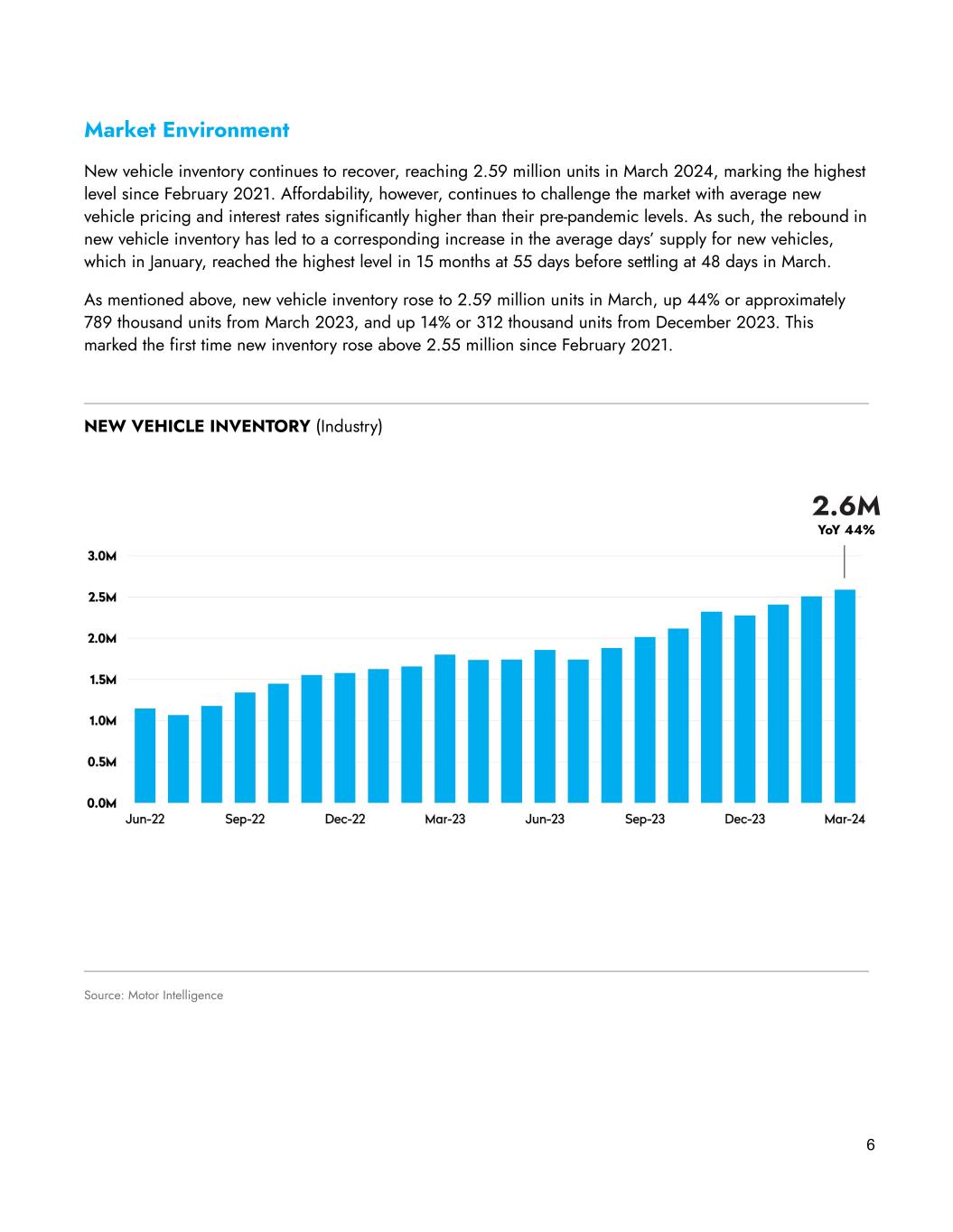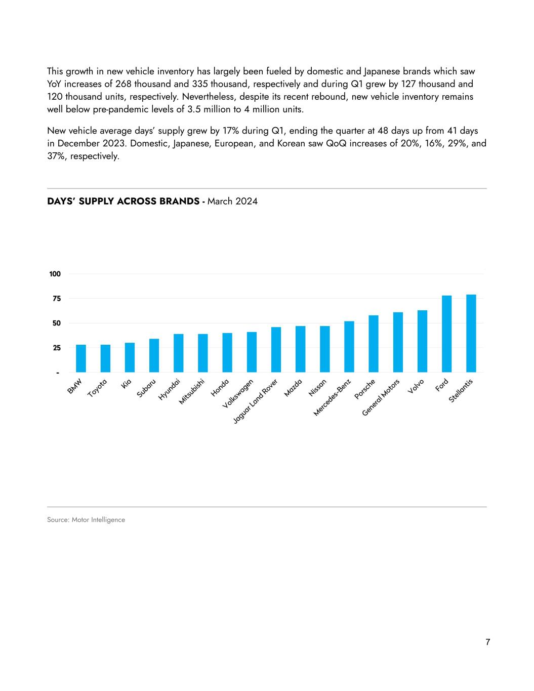 6 Market Environment New vehicle inventory continues to recover, reaching 2.59 million units in March 2024, marking the highest level since February 2021. Affordability, however, continues to challenge the market with average new vehicle pricing and interest rates significantly higher than their pre-pandemic levels. As such, the rebound in new vehicle inventory has led to a corresponding increase in the average days’ supply for new vehicles, which in January, reached the highest level in 15 months at 55 days before settling at 48 days in March. As mentioned above, new vehicle inventory rose to 2.59 million units in March, up 44% or approximately 789 thousand units from March 2023, and up 14% or 312 thousand units from December 2023. This marked the first time new inventory rose above 2.55 million since February 2021. Source: Motor Intelligence NEW VEHICLE INVENTORY (Industry) 2.6M YoY 44%
