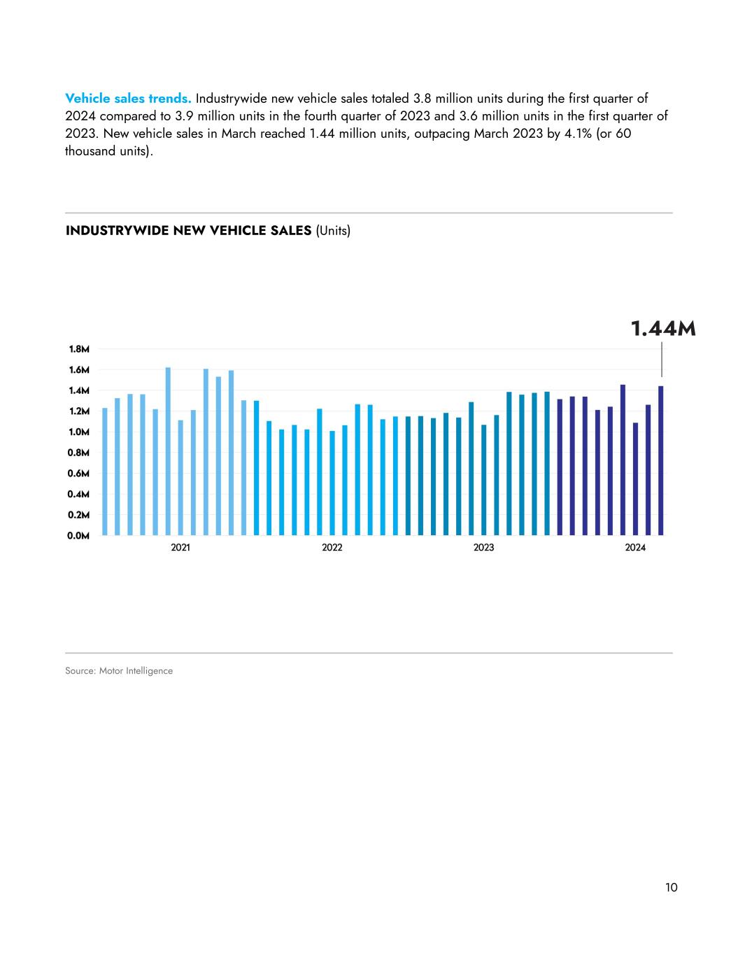 Vehicle sales trends. Industrywide new vehicle sales totaled 3.8 million units during the first quarter of 2024 compared to 3.9 million units in the fourth quarter of 2023 and 3.6 million units in the first quarter of 2023. New vehicle sales in March reached 1.44 million units, outpacing March 2023 by 4.1% (or 60 thousand units). 10 INDUSTRYWIDE NEW VEHICLE SALES (Units) Source: Motor Intelligence 1.44M