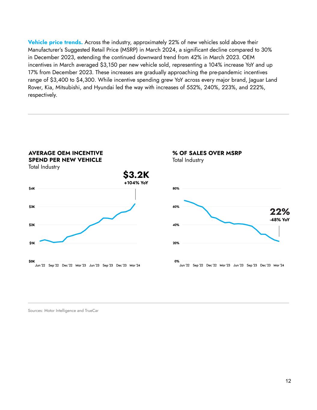 Vehicle price trends. Across the industry, approximately 22% of new vehicles sold above their Manufacturer’s Suggested Retail Price (MSRP) in March 2024, a significant decline compared to 30% in December 2023, extending the continued downward trend from 42% in March 2023. OEM incentives in March averaged $3,150 per new vehicle sold, representing a 104% increase YoY and up 17% from December 2023. These increases are gradually approaching the pre-pandemic incentives range of $3,400 to $4,300. While incentive spending grew YoY across every major brand, Jaguar Land Rover, Kia, Mitsubishi, and Hyundai led the way with increases of 552%, 240%, 223%, and 222%, respectively. 12 Sources: Motor Intelligence and TrueCar AVERAGE OEM INCENTIVE SPEND PER NEW VEHICLE Total Industry % OF SALES OVER MSRP Total Industry $3.2K +104% YoY 22% -48% YoY