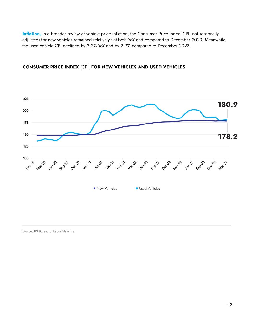 Inflation. In a broader review of vehicle price inflation, the Consumer Price Index (CPI, not seasonally adjusted) for new vehicles remained relatively flat both YoY and compared to December 2023. Meanwhile, the used vehicle CPI declined by 2.2% YoY and by 2.9% compared to December 2023. 13 Source: US Bureau of Labor Statistics CONSUMER PRICE INDEX (CPI) FOR NEW VEHICLES AND USED VEHICLES 180.9 178.2 Used VehiclesNew Vehicles