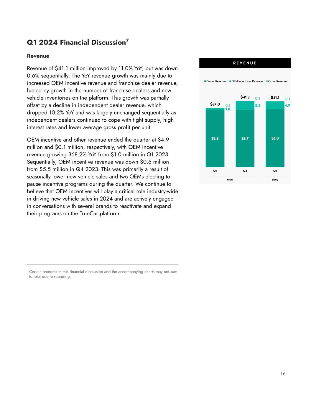 16 Q1 2024 Financial Discussion7 Revenue Revenue of $41.1 million improved by 11.0% YoY, but was down 0.6% sequentially. The YoY revenue growth was mainly due to increased OEM incentive revenue and franchise dealer revenue, fueled by growth in the number of franchise dealers and new vehicle inventories on the platform. This growth was partially offset by a decline in independent dealer revenue, which dropped 10.2% YoY and was largely unchanged sequentially as independent dealers continued to cope with tight supply, high interest rates and lower average gross profit per unit. OEM incentive and other revenue ended the quarter at $4.9 million and $0.1 million, respectively, with OEM incentive revenue growing 368.2% YoY from $1.0 million in Q1 2023. Sequentially, OEM incentive revenue was down $0.6 million from $5.5 million in Q4 2023. This was primarily a result of seasonally lower new vehicle sales and two OEMs electing to pause incentive programs during the quarter. We continue to believe that OEM incentives will play a critical role industry-wide in driving new vehicle sales in 2024 and are actively engaged in conversations with several brands to reactivate and expand their programs on the TrueCar platform. 7 Certain amounts in this financial discussion and the accompanying charts may not sum to total due to rounding.