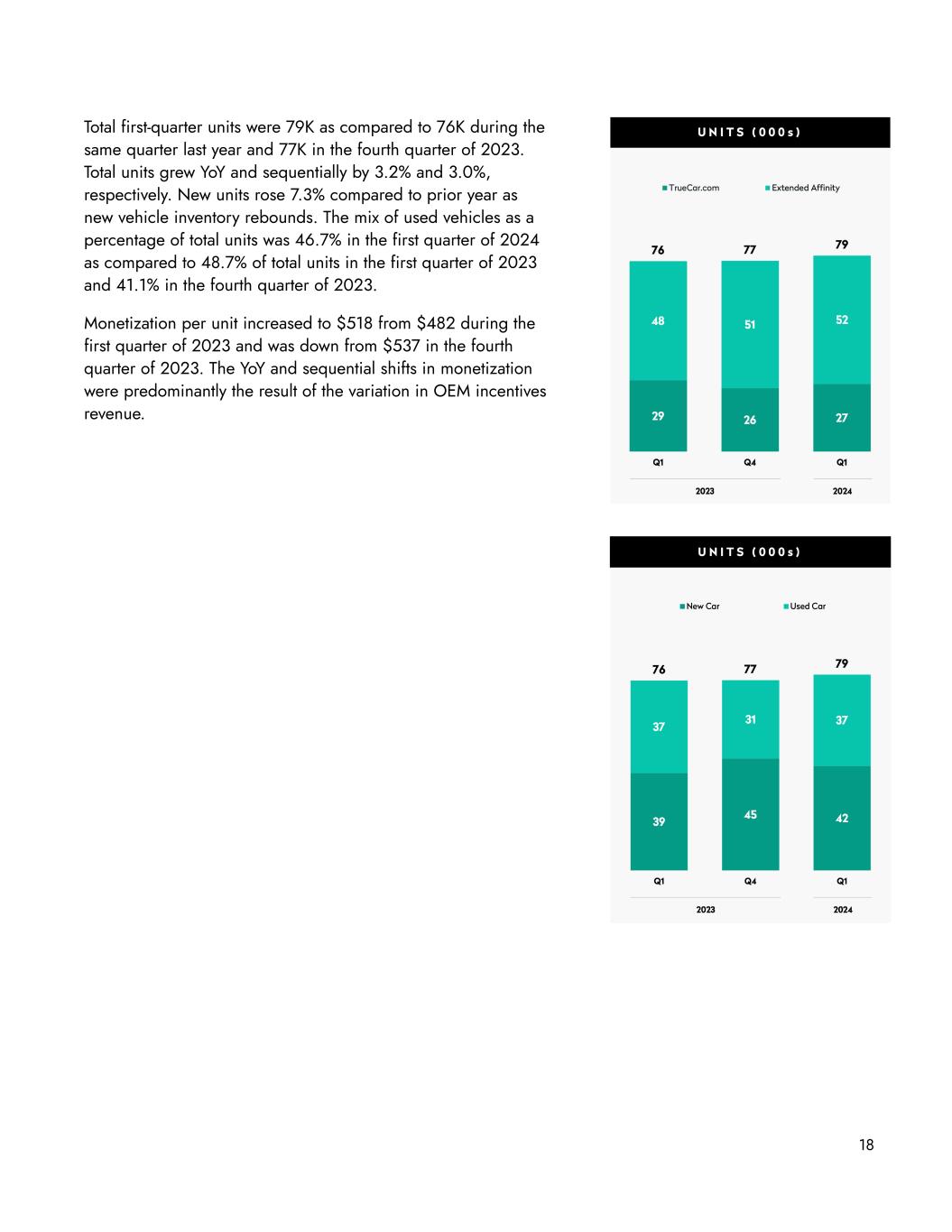 18 Total first-quarter units were 79K as compared to 76K during the same quarter last year and 77K in the fourth quarter of 2023. Total units grew YoY and sequentially by 3.2% and 3.0%, respectively. New units rose 7.3% compared to prior year as new vehicle inventory rebounds. The mix of used vehicles as a percentage of total units was 46.7% in the first quarter of 2024 as compared to 48.7% of total units in the first quarter of 2023 and 41.1% in the fourth quarter of 2023. Monetization per unit increased to $518 from $482 during the first quarter of 2023 and was down from $537 in the fourth quarter of 2023. The YoY and sequential shifts in monetization were predominantly the result of the variation in OEM incentives revenue.