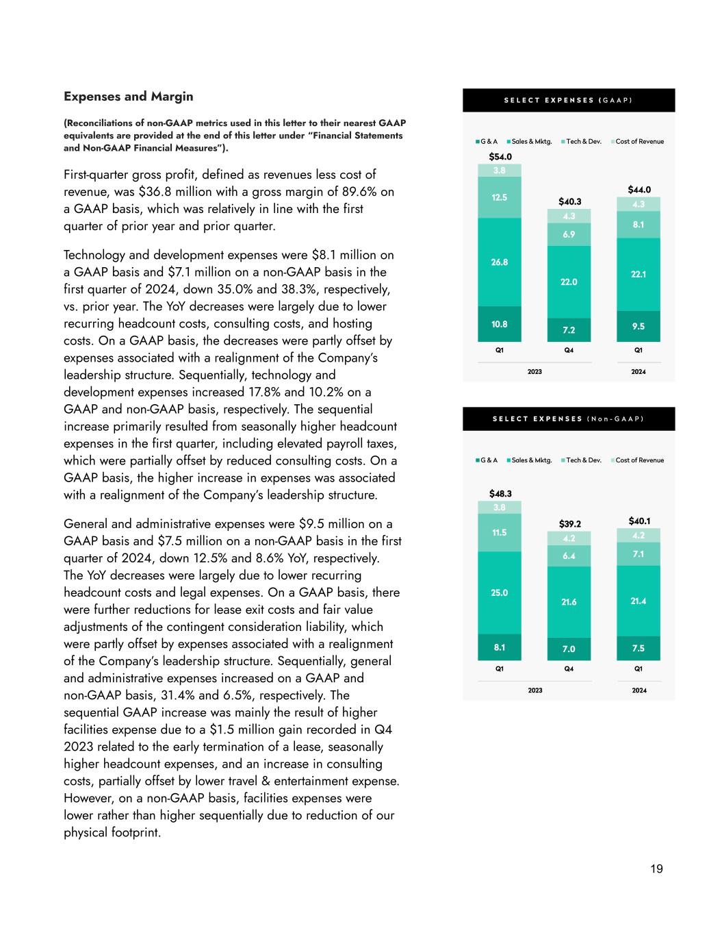 19 Expenses and Margin (Reconciliations of non-GAAP metrics used in this letter to their nearest GAAP equivalents are provided at the end of this letter under “Financial Statements and Non-GAAP Financial Measures”). First-quarter gross profit, defined as revenues less cost of revenue, was $36.8 million with a gross margin of 89.6% on a GAAP basis, which was relatively in line with the first quarter of prior year and prior quarter. Technology and development expenses were $8.1 million on a GAAP basis and $7.1 million on a non-GAAP basis in the first quarter of 2024, down 35.0% and 38.3%, respectively, vs. prior year. The YoY decreases were largely due to lower recurring headcount costs, consulting costs, and hosting costs. On a GAAP basis, the decreases were partly offset by expenses associated with a realignment of the Company’s leadership structure. Sequentially, technology and development expenses increased 17.8% and 10.2% on a GAAP and non-GAAP basis, respectively. The sequential increase primarily resulted from seasonally higher headcount expenses in the first quarter, including elevated payroll taxes, which were partially offset by reduced consulting costs. On a GAAP basis, the higher increase in expenses was associated with a realignment of the Company’s leadership structure. General and administrative expenses were $9.5 million on a GAAP basis and $7.5 million on a non-GAAP basis in the first quarter of 2024, down 12.5% and 8.6% YoY, respectively. The YoY decreases were largely due to lower recurring headcount costs and legal expenses. On a GAAP basis, there were further reductions for lease exit costs and fair value adjustments of the contingent consideration liability, which were partly offset by expenses associated with a realignment of the Company’s leadership structure. Sequentially, general and administrative expenses increased on a GAAP and non-GAAP basis, 31.4% and 6.5%, respectively. The sequential GAAP increase was mainly the result of higher facilities expense due to a $1.5 million gain recorded in Q4 2023 related to the early termination of a lease, seasonally higher headcount expenses, and an increase in consulting costs, partially offset by lower travel & entertainment expense. However, on a non-GAAP basis, facilities expenses were lower rather than higher sequentially due to reduction of our physical footprint.