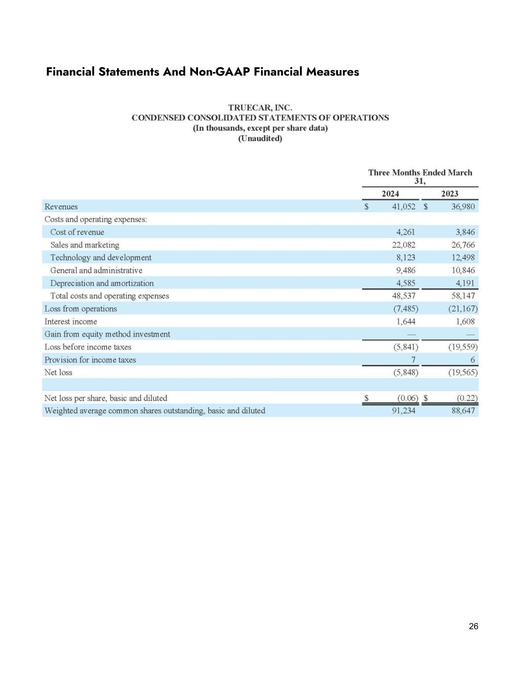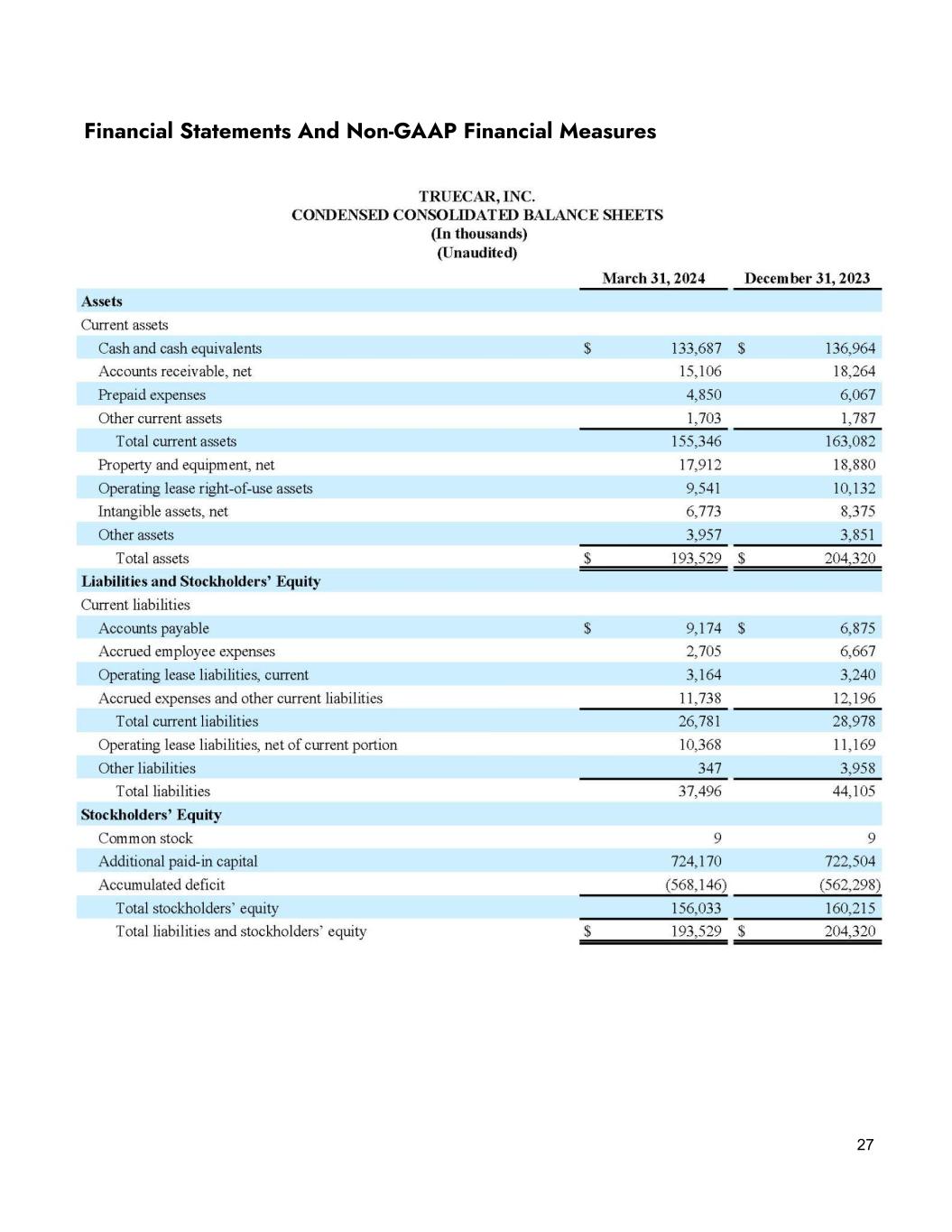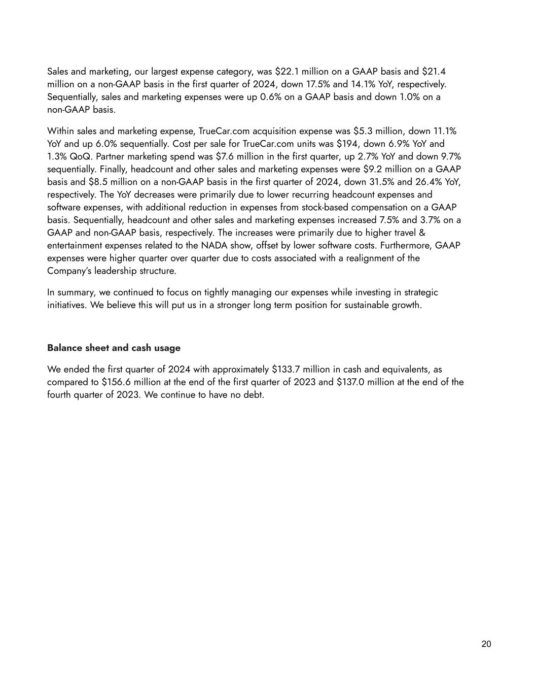 20 Sales and marketing, our largest expense category, was $22.1 million on a GAAP basis and $21.4 million on a non-GAAP basis in the first quarter of 2024, down 17.5% and 14.1% YoY, respectively. Sequentially, sales and marketing expenses were up 0.6% on a GAAP basis and down 1.0% on a non-GAAP basis. Within sales and marketing expense, TrueCar.com acquisition expense was $5.3 million, down 11.1% YoY and up 6.0% sequentially. Cost per sale for TrueCar.com units was $194, down 6.9% YoY and 1.3% QoQ. Partner marketing spend was $7.6 million in the first quarter, up 2.7% YoY and down 9.7% sequentially. Finally, headcount and other sales and marketing expenses were $9.2 million on a GAAP basis and $8.5 million on a non-GAAP basis in the first quarter of 2024, down 31.5% and 26.4% YoY, respectively. The YoY decreases were primarily due to lower recurring headcount expenses and software expenses, with additional reduction in expenses from stock-based compensation on a GAAP basis. Sequentially, headcount and other sales and marketing expenses increased 7.5% and 3.7% on a GAAP and non-GAAP basis, respectively. The increases were primarily due to higher travel & entertainment expenses related to the NADA show, offset by lower software costs. Furthermore, GAAP expenses were higher quarter over quarter due to costs associated with a realignment of the Company’s leadership structure. In summary, we continued to focus on tightly managing our expenses while investing in strategic initiatives. We believe this will put us in a stronger long term position for sustainable growth. Balance sheet and cash usage We ended the first quarter of 2024 with approximately $133.7 million in cash and equivalents, as compared to $156.6 million at the end of the first quarter of 2023 and $137.0 million at the end of the fourth quarter of 2023. We continue to have no debt.