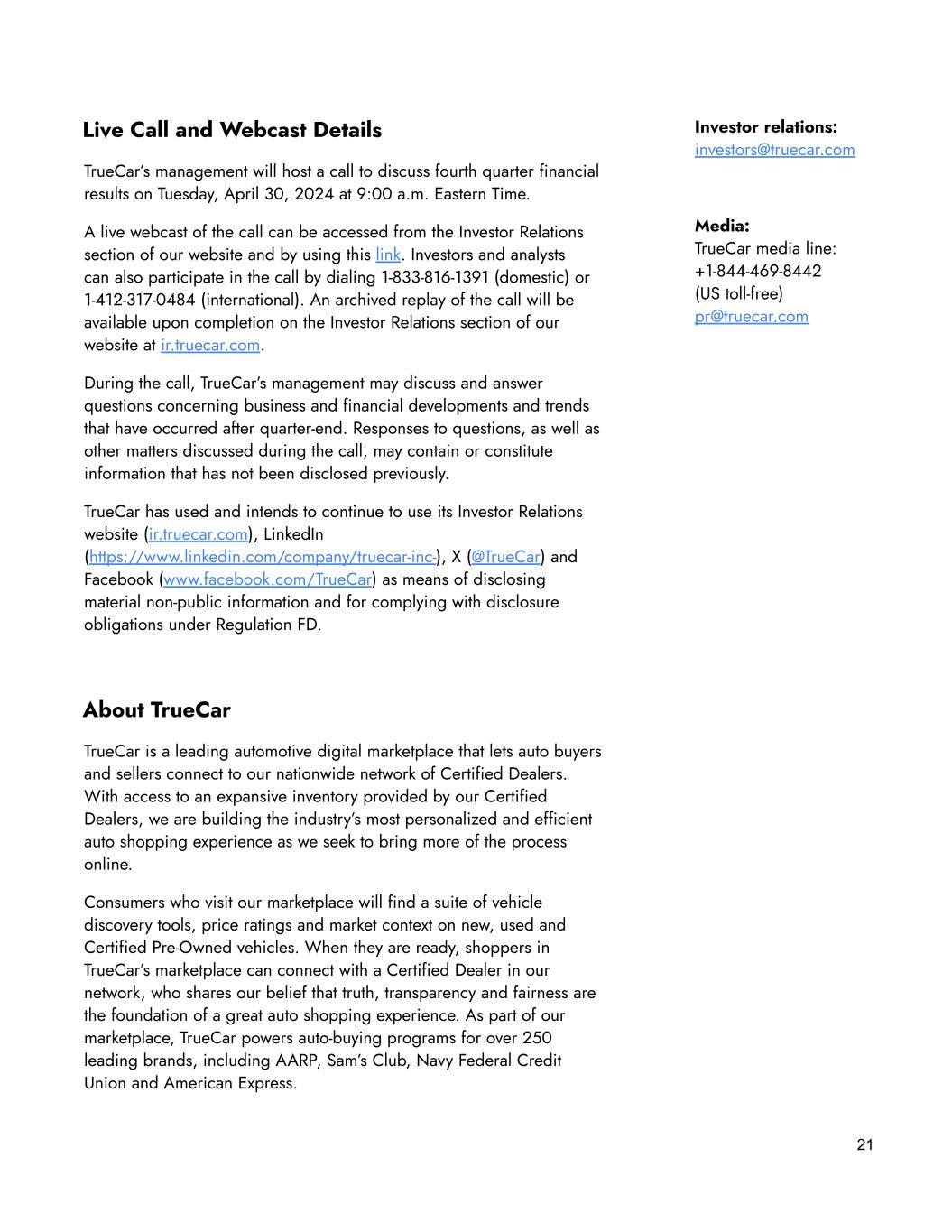 21 Investor relations: investors@truecar.com Media: TrueCar media line: +1-844-469-8442 (US toll-free) pr@truecar.com Live Call and Webcast Details TrueCar’s management will host a call to discuss fourth quarter financial results on Tuesday, April 30, 2024 at 9:00 a.m. Eastern Time. A live webcast of the call can be accessed from the Investor Relations section of our website and by using this link. Investors and analysts can also participate in the call by dialing 1-833-816-1391 (domestic) or 1-412-317-0484 (international). An archived replay of the call will be available upon completion on the Investor Relations section of our website at ir.truecar.com. During the call, TrueCar’s management may discuss and answer questions concerning business and financial developments and trends that have occurred after quarter-end. Responses to questions, as well as other matters discussed during the call, may contain or constitute information that has not been disclosed previously. TrueCar has used and intends to continue to use its Investor Relations website (ir.truecar.com), LinkedIn (https://www.linkedin.com/company/truecar-inc-), X (@TrueCar) and Facebook (www.facebook.com/TrueCar) as means of disclosing material non-public information and for complying with disclosure obligations under Regulation FD. About TrueCar TrueCar is a leading automotive digital marketplace that lets auto buyers and sellers connect to our nationwide network of Certified Dealers. With access to an expansive inventory provided by our Certified Dealers, we are building the industry’s most personalized and efficient auto shopping experience as we seek to bring more of the process online. Consumers who visit our marketplace will find a suite of vehicle discovery tools, price ratings and market context on new, used and Certified Pre-Owned vehicles. When they are ready, shoppers in TrueCar’s marketplace can connect with a Certified Dealer in our network, who shares our belief that truth, transparency and fairness are the foundation of a great auto shopping experience. As part of our marketplace, TrueCar powers auto-buying programs for over 250 leading brands, including AARP, Sam’s Club, Navy Federal Credit Union and American Express.