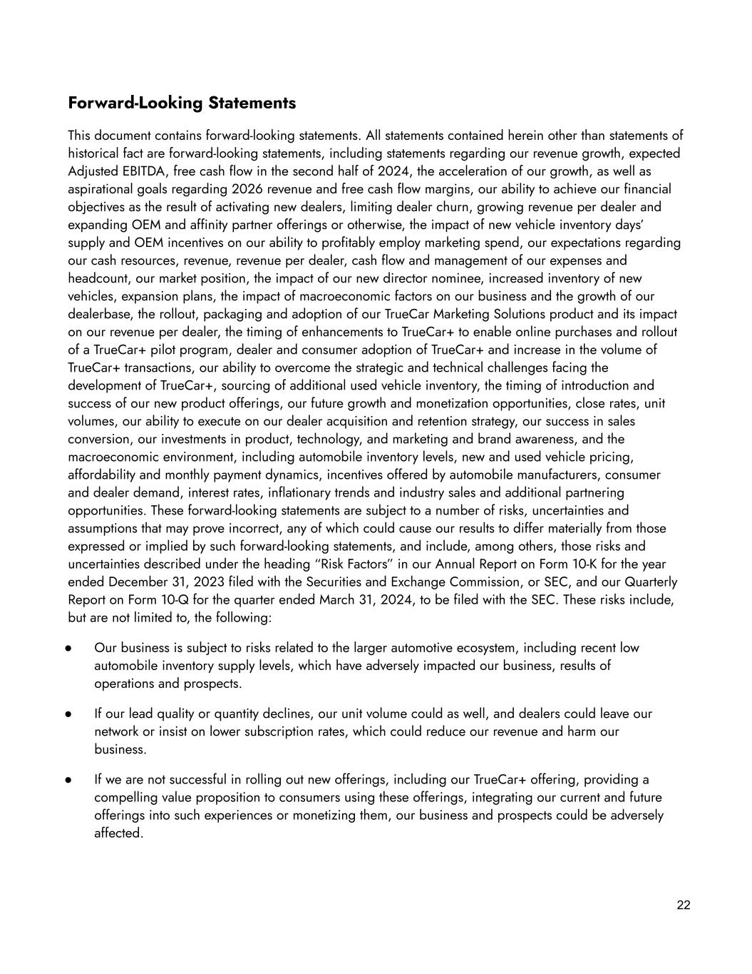 22 Forward-Looking Statements This document contains forward-looking statements. All statements contained herein other than statements of historical fact are forward-looking statements, including statements regarding our revenue growth, expected Adjusted EBITDA, free cash flow in the second half of 2024, the acceleration of our growth, as well as aspirational goals regarding 2026 revenue and free cash flow margins, our ability to achieve our financial objectives as the result of activating new dealers, limiting dealer churn, growing revenue per dealer and expanding OEM and affinity partner offerings or otherwise, the impact of new vehicle inventory days’ supply and OEM incentives on our ability to profitably employ marketing spend, our expectations regarding our cash resources, revenue, revenue per dealer, cash flow and management of our expenses and headcount, our market position, the impact of our new director nominee, increased inventory of new vehicles, expansion plans, the impact of macroeconomic factors on our business and the growth of our dealerbase, the rollout, packaging and adoption of our TrueCar Marketing Solutions product and its impact on our revenue per dealer, the timing of enhancements to TrueCar+ to enable online purchases and rollout of a TrueCar+ pilot program, dealer and consumer adoption of TrueCar+ and increase in the volume of TrueCar+ transactions, our ability to overcome the strategic and technical challenges facing the development of TrueCar+, sourcing of additional used vehicle inventory, the timing of introduction and success of our new product offerings, our future growth and monetization opportunities, close rates, unit volumes, our ability to execute on our dealer acquisition and retention strategy, our success in sales conversion, our investments in product, technology, and marketing and brand awareness, and the macroeconomic environment, including automobile inventory levels, new and used vehicle pricing, affordability and monthly payment dynamics, incentives offered by automobile manufacturers, consumer and dealer demand, interest rates, inflationary trends and industry sales and additional partnering opportunities. These forward-looking statements are subject to a number of risks, uncertainties and assumptions that may prove incorrect, any of which could cause our results to differ materially from those expressed or implied by such forward-looking statements, and include, among others, those risks and uncertainties described under the heading “Risk Factors” in our Annual Report on Form 10-K for the year ended December 31, 2023 filed with the Securities and Exchange Commission, or SEC, and our Quarterly Report on Form 10-Q for the quarter ended March 31, 2024, to be filed with the SEC. These risks include, but are not limited to, the following: ● Our business is subject to risks related to the larger automotive ecosystem, including recent low automobile inventory supply levels, which have adversely impacted our business, results of operations and prospects. ● If our lead quality or quantity declines, our unit volume could as well, and dealers could leave our network or insist on lower subscription rates, which could reduce our revenue and harm our business. ● If we are not successful in rolling out new offerings, including our TrueCar+ offering, providing a compelling value proposition to consumers using these offerings, integrating our current and future offerings into such experiences or monetizing them, our business and prospects could be adversely affected.