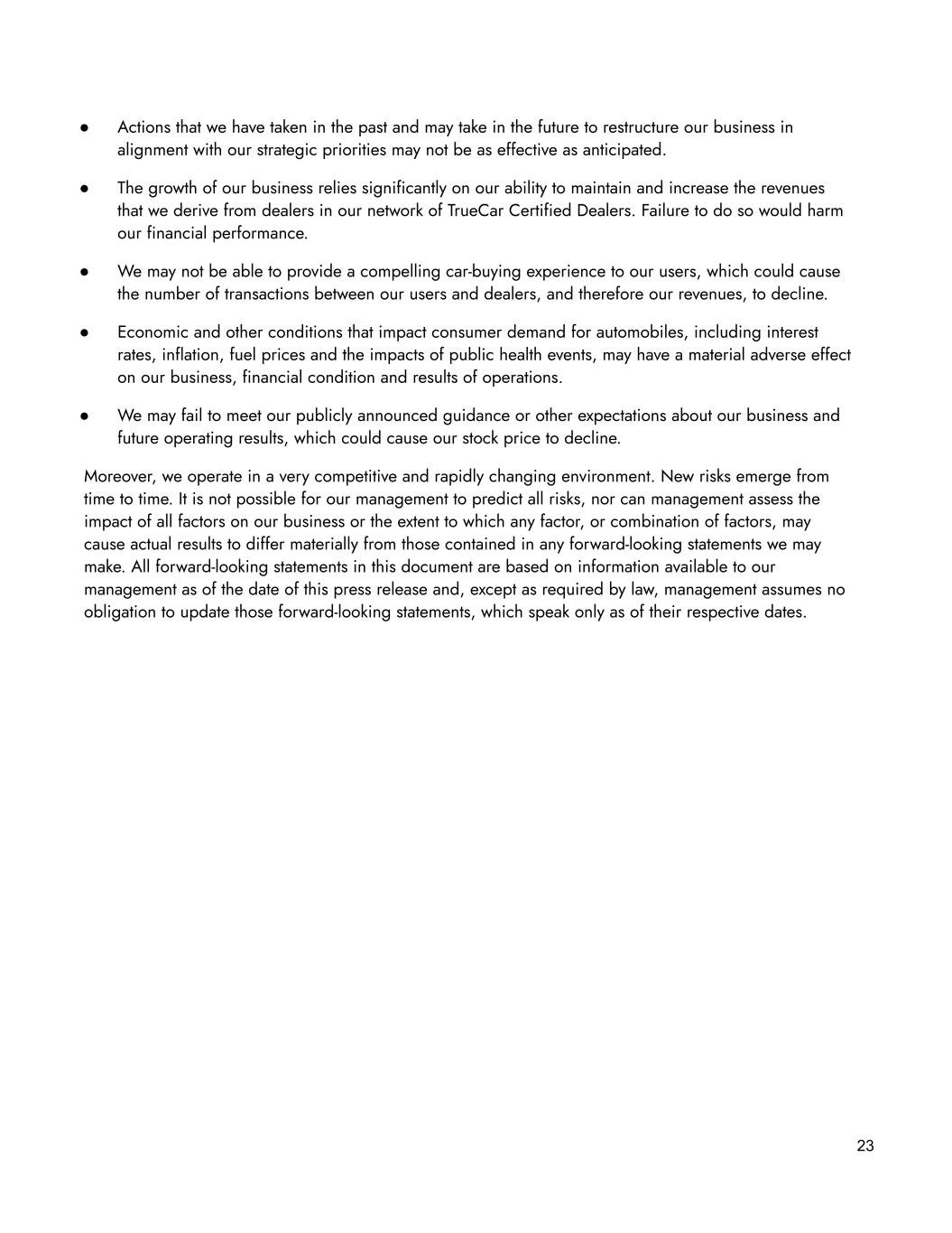 23 ● Actions that we have taken in the past and may take in the future to restructure our business in alignment with our strategic priorities may not be as effective as anticipated. ● The growth of our business relies significantly on our ability to maintain and increase the revenues that we derive from dealers in our network of TrueCar Certified Dealers. Failure to do so would harm our financial performance. ● We may not be able to provide a compelling car-buying experience to our users, which could cause the number of transactions between our users and dealers, and therefore our revenues, to decline. ● Economic and other conditions that impact consumer demand for automobiles, including interest rates, inflation, fuel prices and the impacts of public health events, may have a material adverse effect on our business, financial condition and results of operations. ● We may fail to meet our publicly announced guidance or other expectations about our business and future operating results, which could cause our stock price to decline. Moreover, we operate in a very competitive and rapidly changing environment. New risks emerge from time to time. It is not possible for our management to predict all risks, nor can management assess the impact of all factors on our business or the extent to which any factor, or combination of factors, may cause actual results to differ materially from those contained in any forward-looking statements we may make. All forward-looking statements in this document are based on information available to our management as of the date of this press release and, except as required by law, management assumes no obligation to update those forward-looking statements, which speak only as of their respective dates.