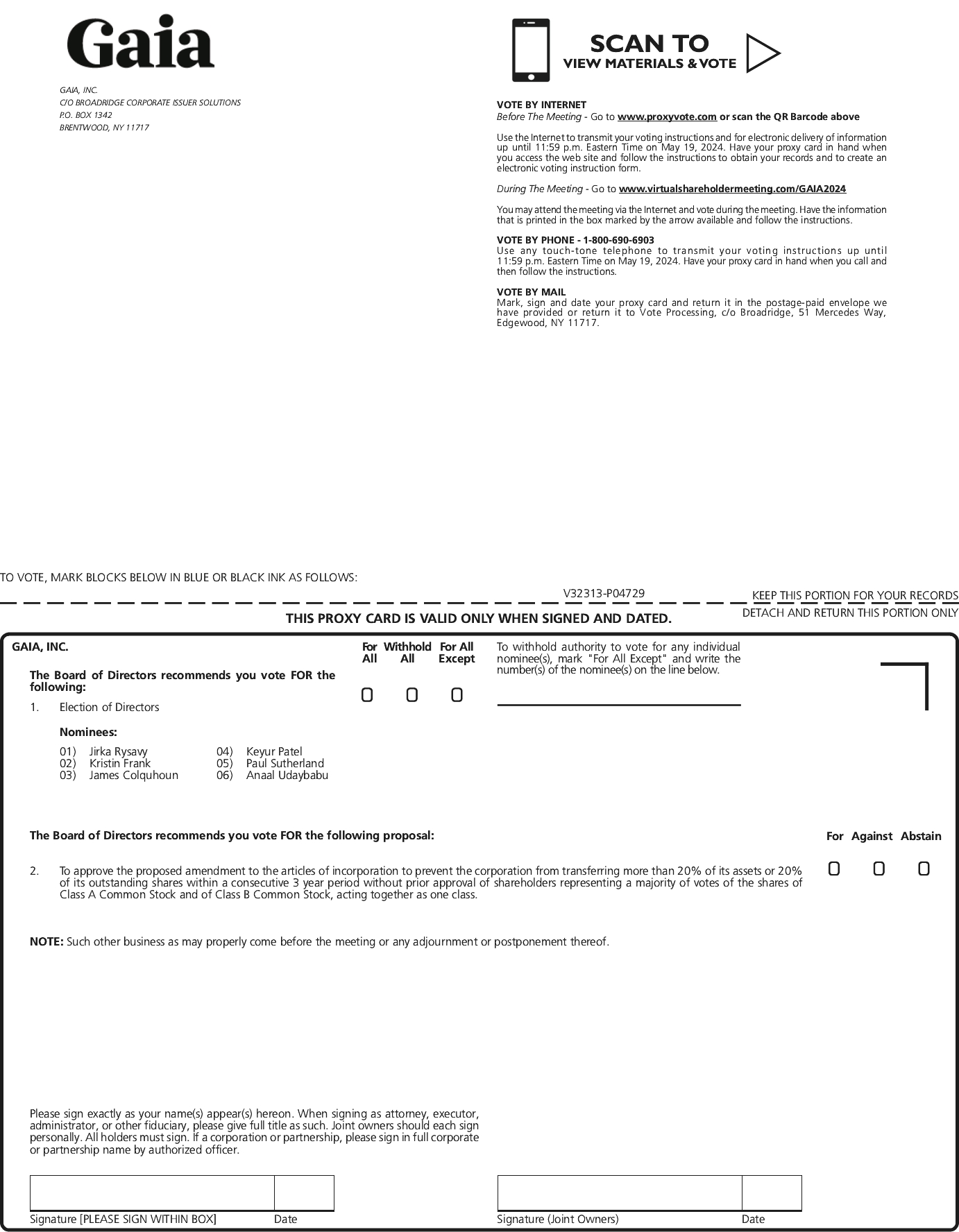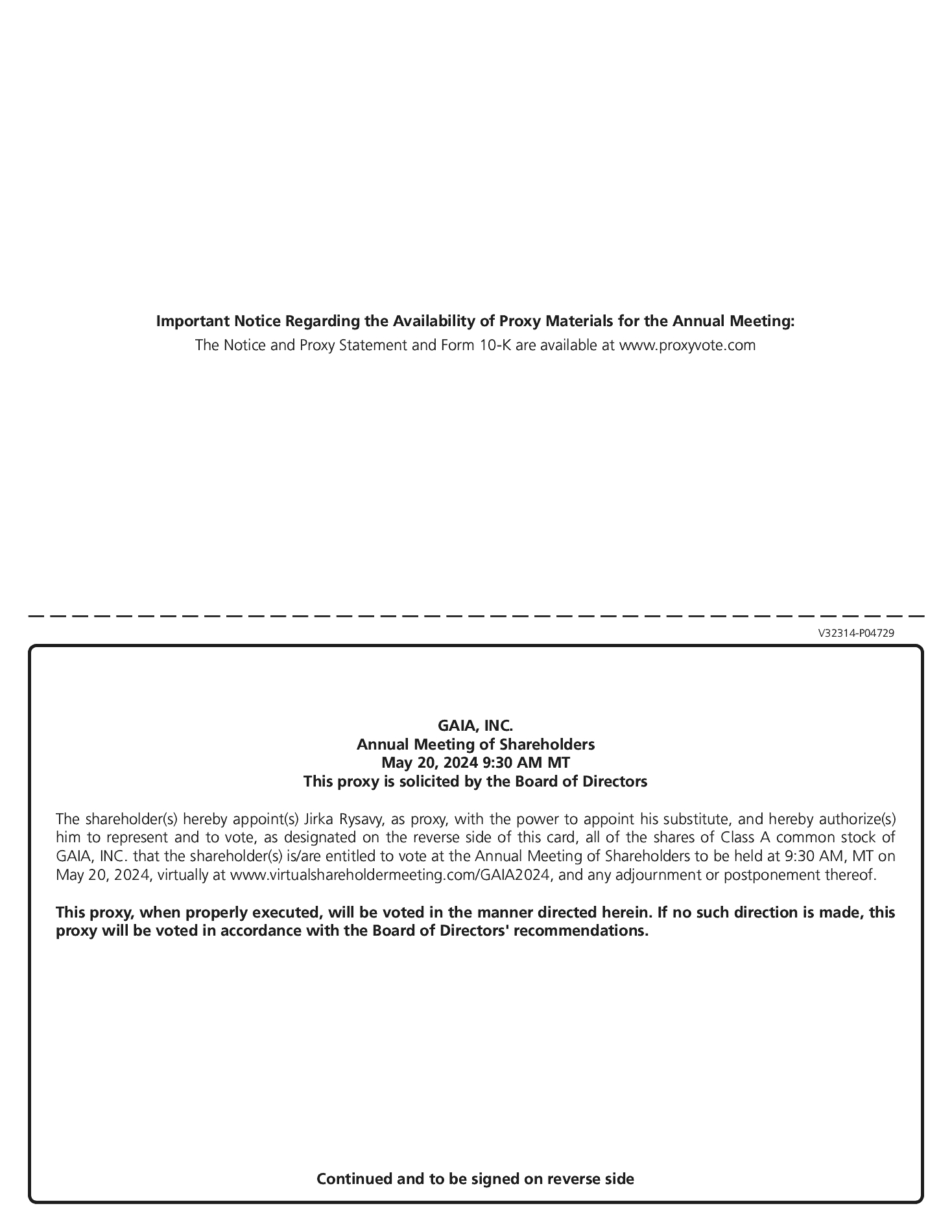 (5) | Ms. Medvedich will vest 12,403 RSUs on March 31, 2024 and 34,688 RSUs on March 31, 2026, in each case, provided that Ms. Medvedich is still an employee or director of Gaia on that date. |