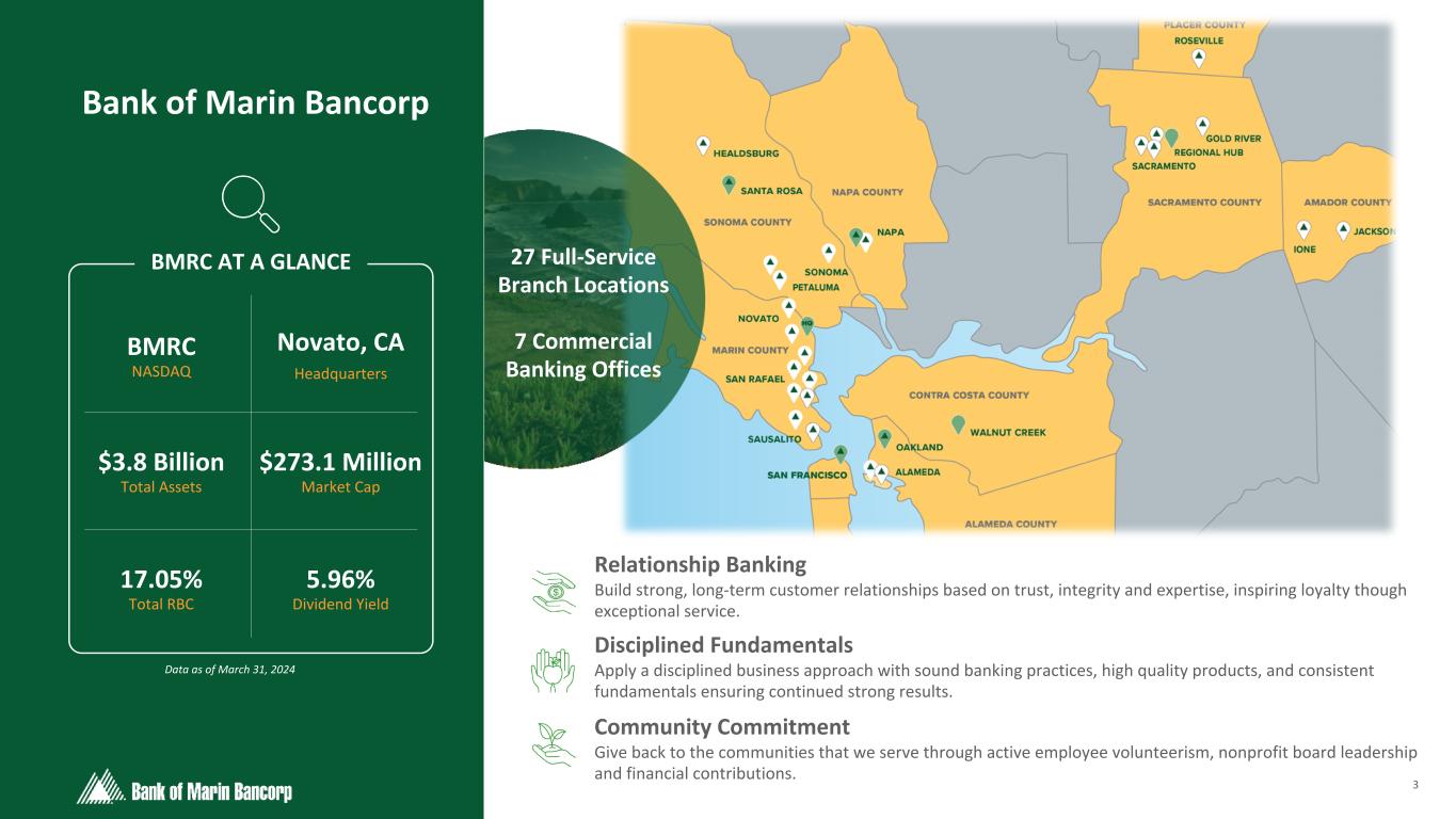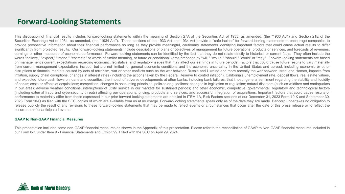 2 Text 95,96,96 Light Gray 232, 232, 232 Black 0, 0, 0 White 255, 255, 255 Accent 1 7,89,52 Accent 2 248,153,40 Accent 3 254,217,129 Accent 4 52,153,70 Accent 5 5,39,67 Accent 6 171,184,195 Forward-Looking Statements This discussion of financial results includes forward-looking statements within the meaning of Section 27A of the Securities Act of 1933, as amended, (the "1933 Act") and Section 21E of the Securities Exchange Act of 1934, as amended, (the "1934 Act"). Those sections of the 1933 Act and 1934 Act provide a "safe harbor" for forward-looking statements to encourage companies to provide prospective information about their financial performance so long as they provide meaningful, cautionary statements identifying important factors that could cause actual results to differ significantly from projected results. Our forward-looking statements include descriptions of plans or objectives of management for future operations, products or services, and forecasts of revenues, earnings or other measures of economic performance. Forward-looking statements can be identified by the fact that they do not relate strictly to historical or current facts. They often include the words "believe," "expect," "intend," "estimate" or words of similar meaning, or future or conditional verbs preceded by "will," "would," "should," "could" or "may." Forward-looking statements are based on management's current expectations regarding economic, legislative, and regulatory issues that may affect our earnings in future periods. Factors that could cause future results to vary materially from current management expectations include, but are not limited to, general economic conditions and the economic uncertainty in the United States and abroad, including economic or other disruptions to financial markets caused by acts of terrorism, war or other conflicts such as the war between Russia and Ukraine and more recently the war between Israel and Hamas, impacts from inflation, supply chain disruptions, changes in interest rates (including the actions taken by the Federal Reserve to control inflation), California's unemployment rate, deposit flows, real estate values, and expected future cash flows on loans and securities; the impact of adverse developments at other banks, including bank failures, that impact general sentiment regarding the stability and liquidity of banks; costs or effects of acquisitions; competition; changes in accounting principles, policies or guidelines; changes in legislation or regulation; natural disasters (such as wildfires and earthquakes in our area); adverse weather conditions; interruptions of utility service in our markets for sustained periods; and other economic, competitive, governmental, regulatory and technological factors (including external fraud and cybersecurity threats) affecting our operations, pricing, products and services; and successful integration of acquisitions. Important factors that could cause results or performance to materially differ from those expressed in our prior forward-looking statements are detailed in ITEM 1A, Risk Factors sections of our December 31, 2023 Form 10-K and September 30, 2023 Form 10-Q as filed with the SEC, copies of which are available from us at no charge. Forward-looking statements speak only as of the date they are made. Bancorp undertakes no obligation to release publicly the result of any revisions to these forward-looking statements that may be made to reflect events or circumstances that occur after the date of this press release or to reflect the occurrence of unanticipated events. GAAP to Non-GAAP Financial Measures This presentation includes some non-GAAP financial measures as shown in the Appendix of this presentation. Please refer to the reconciliation of GAAP to Non-GAAP financial measures included in our Form 8-K under Item 9 - Financial Statements and Exhibit 99.1 filed with the SEC on April 29, 2024.