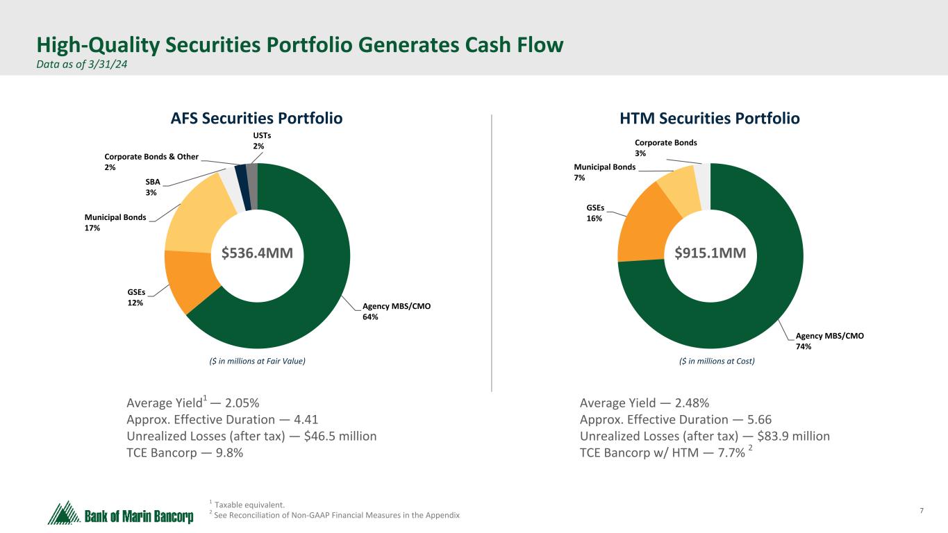 6 Text 95,96,96 Light Gray 232, 232, 232 Black 0, 0, 0 White 255, 255, 255 Accent 1 7,89,52 Accent 2 248,153,40 Accent 3 254,217,129 Accent 4 52,153,70 Accent 5 5,39,67 Accent 6 171,184,195 Strategic Balance Sheet Repositioning During Last Quarter • Bank generated $126 million in proceeds from AFS security sales with an average yield of 1.50%. • Proceeds paid down borrowings and were reinvested into higher yielding assets • Anticipated benefits to: earnings per share, net interest margin, return on assets, and other metrics • POST REPOSITIONING, AVERAGE BOOK YIELD OF SECURITIES PORTFOLIO INCREASED 7 BPS AND EFFECTIVE DURATION INCREASED 0.2 (in thousands) Market Value AFS & HTM Securities T/E Book Yield Effective Duration Pre-Tax Unrealized Gains (Losses) Pre-Tax Realized Losses After-Tax Realized Losses1 AFS % of Total Investments Securities Portfolio as of 9/30/2023 $1,442,031 2.24% 4.9 $(248,149) N/A N/A 45% Q4 Securities Sales $125,955 1.50% 1.5 $5,907 $(5,907) $(4,160) Q4 Change in Pre-Tax Unrealized Losses N/A N/A N/A $70,423 N/A N/A Securities Portfolio as of 12/31/2023 $1,366,858 2.31% 5.1 $(171,819) N/A N/A 36% 1 Applied a blended state and federal statutory rate of 29.56%,