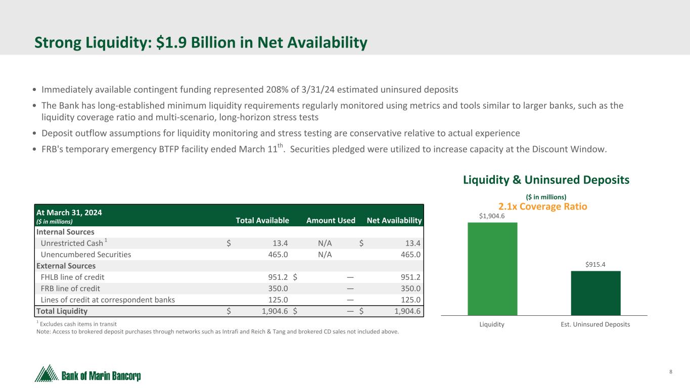 7 Text 95,96,96 Light Gray 232, 232, 232 Black 0, 0, 0 White 255, 255, 255 Accent 1 7,89,52 Accent 2 248,153,40 Accent 3 254,217,129 Accent 4 52,153,70 Accent 5 5,39,67 Accent 6 171,184,195 1 Taxable equivalent. 2 See Reconciliation of Non-GAAP Financial Measures in the Appendix High-Quality Securities Portfolio Generates Cash Flow Data as of 3/31/24 AFS Securities Portfolio Agency MBS/CMO 64% GSEs 12% Municipal Bonds 17% SBA 3% Corporate Bonds & Other 2% USTs 2% ($ in millions at Fair Value) $536.4MM HTM Securities Portfolio Agency MBS/CMO 74% GSEs 16% Municipal Bonds 7% Corporate Bonds 3% $915.1MM ($ in millions at Cost) Average Yield1 — 2.05% Approx. Effective Duration — 4.41 Unrealized Losses (after tax) — $46.5 million TCE Bancorp — 9.8% Average Yield — 2.48% Approx. Effective Duration — 5.66 Unrealized Losses (after tax) — $83.9 million TCE Bancorp w/ HTM — 7.7% 2