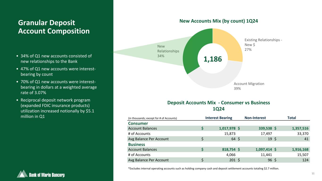 10 Text 95,96,96 Light Gray 232, 232, 232 Black 0, 0, 0 White 255, 255, 255 Accent 1 7,89,52 Accent 2 248,153,40 Accent 3 254,217,129 Accent 4 52,153,70 Accent 5 5,39,67 Accent 6 171,184,195 Strong Deposit Franchise • Deposit mix continues to favor a high percentage of non-interest bearing deposits • Total cost of deposits was 1.38% (interest-bearing 2.46%) for Q1 and 1.41% (interest-bearing 2.50%) for the month of March • Time deposit balances grew $16.2 million in Q1 with the total time deposit portfolio average maturity of approximately six months and an average rate of 3.17%. Approximately 93% of time deposits mature within 12 months. • Our time deposits are not derived from brokered CD markets or advertised CD specials. Total Deposit Mix at 1Q24Total Deposits ($ in millions) $2,337 $2,504 $3,808 $3,574 $3,290 $3,284 $1,271 $1,538 $2,201 $2,127 $1,667 $1,656 $968 $869 $1,457 $1,328 $1,372 $1,361$98 $97 $150 $119 $251 $267 Transaction Savings & MMDA Time 2019 2020 2021 2022 2023 1Q24 Non-Interest Bearing 44.0% IB DDA 6.5% Savings 6.8% Money Market 34.6% Time 8.1% $3.28B