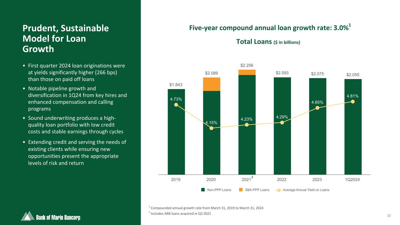 11 Text 95,96,96 Light Gray 232, 232, 232 Black 0, 0, 0 White 255, 255, 255 Accent 1 7,89,52 Accent 2 248,153,40 Accent 3 254,217,129 Accent 4 52,153,70 Accent 5 5,39,67 Accent 6 171,184,195 • 34% of Q1 new accounts consisted of new relationships to the Bank • 47% of Q1 new accounts were interest- bearing by count • 70% of Q1 new accounts were interest- bearing in dollars at a weighted average rate of 3.07% • Reciprocal deposit network program (expanded FDIC insurance products) utilization increased notionally by $5.1 million in Q1 New Accounts Mix (by count) 1Q24Granular Deposit Account Composition Existing Relationships - New $ 27% Account Migration 39% New Relationships 34% 1,186 (in thousands; except for # of Accounts) Interest Bearing Non-Interest Bearing Total Consumer Account Balances $ 1,017,978 $ 339,538 $ 1,357,516 # of Accounts 15,873 17,497 33,370 Avg Balance Per Account $ 64 $ 19 $ 41 Business Account Balances $ 818,754 $ 1,097,414 $ 1,916,168 # of Accounts 4,066 11,441 15,507 Avg Balance Per Account $ 201 $ 96 $ 124 *Excludes internal operating accounts such as holding company cash and deposit settlement accounts totaling $2.7 million. Deposit Accounts Mix - Consumer vs Business 1Q24