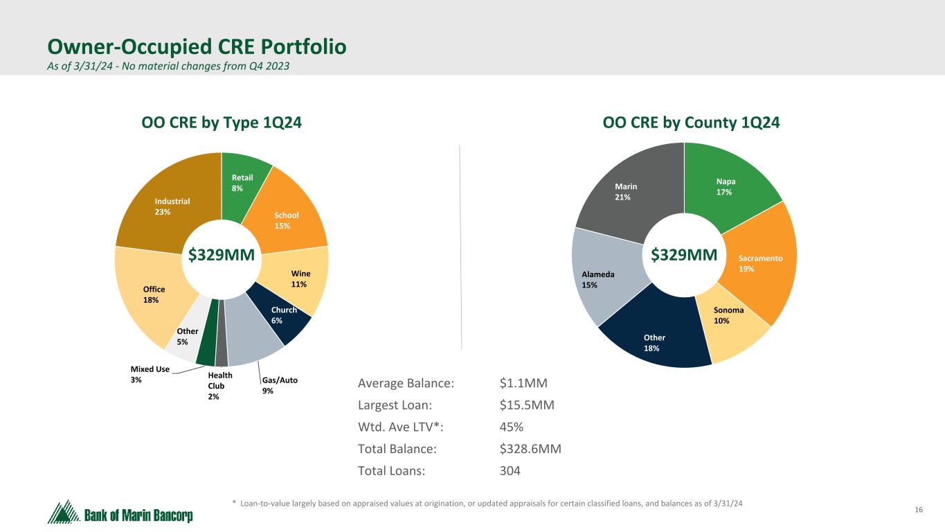 15 Text 95,96,96 Light Gray 232, 232, 232 Black 0, 0, 0 White 255, 255, 255 Accent 1 7,89,52 Accent 2 248,153,40 Accent 3 254,217,129 Accent 4 52,153,70 Accent 5 5,39,67 Accent 6 171,184,195 • $367 million in credit exposure spread across our lending footprint comprised of 151 loans • $2.4 million average loan balance – largest loan at $16.8 million • 60% weighted average loan-to-value and 1.58x weighted average debt-service coverage ratio* • City of San Francisco NOO-CRE office exposure is 3% of total loan portfolio and 6% of total NOO-CRE loans NOO-CRE Office Portfolio by County * Calculated for loans exceeding $1 million, based on the most recent annual review process Non-owner Occupied Office Exposure As of 3/31/24 - No material changes from Q4 2023 San Francisco 19% Alameda 6% Sacramento 7% Napa 10% Other Bay Area 13% Other 4% Marin 24% Sonoma 17% $367MM City of S.F. NOO-CRE Office Portfolio Total Balance: $70.5 million Average Loan Bal: $5.4 million Number of Loans: 13 loans Average LTV*: 70% Average DCR: 0.99x Average Occupancy: 78% 12 of the 13 loans are secured by low rise buildings and one loan is secured by a 10 story building.