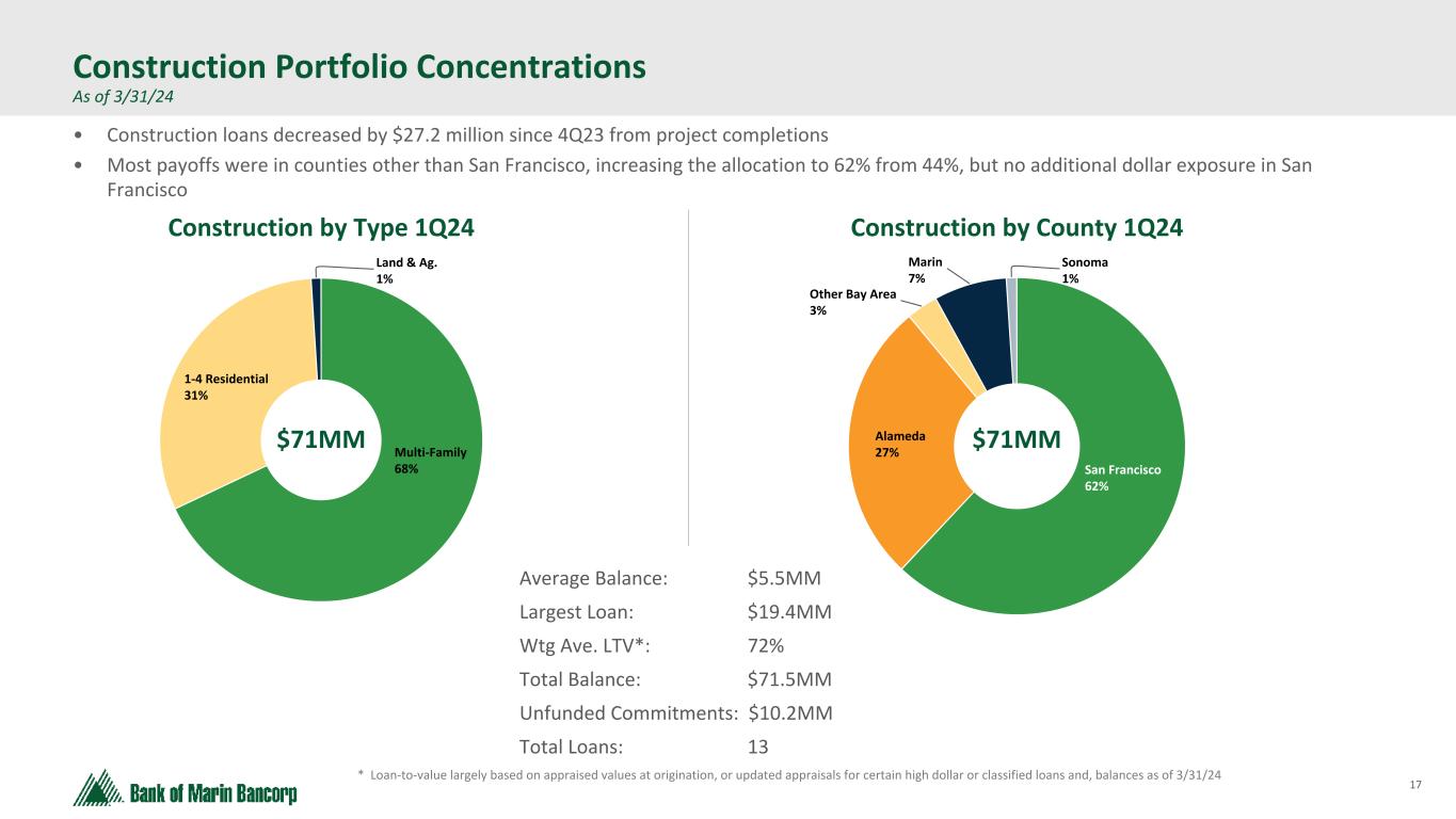 16 Text 95,96,96 Light Gray 232, 232, 232 Black 0, 0, 0 White 255, 255, 255 Accent 1 7,89,52 Accent 2 248,153,40 Accent 3 254,217,129 Accent 4 52,153,70 Accent 5 5,39,67 Accent 6 171,184,195 ($ in millions at Fair Value) * Loan-to-value largely based on appraised values at origination, or updated appraisals for certain classified loans, and balances as of 3/31/24 Owner-Occupied CRE Portfolio As of 3/31/24 - No material changes from Q4 2023 Retail 8% School 15% Wine 11% Church 6% Gas/Auto 9% Health Club 2% Mixed Use 3% Other 5% Office 18% Industrial 23% Napa 17% Sacramento 19% Sonoma 10% Other 18% Alameda 15% Marin 21% OO CRE by County 1Q24 Average Balance: $1.1MM Largest Loan: $15.5MM Wtd. Ave LTV*: 45% Total Balance: $328.6MM Total Loans: 304 OO CRE by Type 1Q24 $329MM $329MM