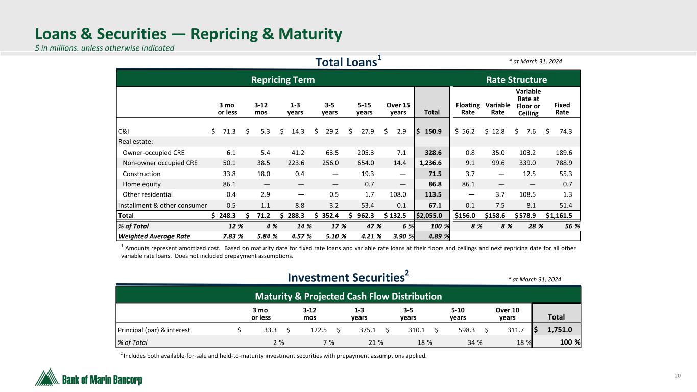 20 Text 95,96,96 Light Gray 232, 232, 232 Black 0, 0, 0 White 255, 255, 255 Accent 1 7,89,52 Accent 2 248,153,40 Accent 3 254,217,129 Accent 4 52,153,70 Accent 5 5,39,67 Accent 6 171,184,195 Loans & Securities — Repricing & Maturity $ in millions, unless otherwise indicated Total Loans1 * at March 31, 2024 Repricing Term Rate Structure 3 mo or less 3-12 mos 1-3 years 3-5 years 5-15 years Over 15 years Total Floating Rate Variable Rate Variable Rate at Floor or Ceiling Fixed Rate C&I $ 71.3 $ 5.3 $ 14.3 $ 29.2 $ 27.9 $ 2.9 $ 150.9 $ 56.2 $ 12.8 $ 7.6 $ 74.3 Real estate: Owner-occupied CRE 6.1 5.4 41.2 63.5 205.3 7.1 328.6 0.8 35.0 103.2 189.6 Non-owner occupied CRE 50.1 38.5 223.6 256.0 654.0 14.4 1,236.6 9.1 99.6 339.0 788.9 Construction 33.8 18.0 0.4 — 19.3 — 71.5 3.7 — 12.5 55.3 Home equity 86.1 — — — 0.7 — 86.8 86.1 — — 0.7 Other residential 0.4 2.9 — 0.5 1.7 108.0 113.5 — 3.7 108.5 1.3 Installment & other consumer 0.5 1.1 8.8 3.2 53.4 0.1 67.1 0.1 7.5 8.1 51.4 Total $ 248.3 $ 71.2 $ 288.3 $ 352.4 $ 962.3 $ 132.5 $ 2,055.0 $ 156.0 $ 158.6 $ 578.9 $ 1,161.5 % of Total 12 % 4 % 14 % 17 % 47 % 6 % 100 % 8 % 8 % 28 % 56 % Weighted Average Rate 7.83 % 5.84 % 4.57 % 5.10 % 4.21 % 3.90 % 4.89 % 1 Amounts represent amortized cost. Based on maturity date for fixed rate loans and variable rate loans at their floors and ceilings and next repricing date for all other variable rate loans. Does not included prepayment assumptions. Investment Securities2 * at March 31, 2024 2 Includes both available-for-sale and held-to-maturity investment securities with prepayment assumptions applied. Maturity & Projected Cash Flow Distribution 3 mo or less 3-12 mos 1-3 years 3-5 years 5-10 years Over 10 years Total Principal (par) & interest $ 33.3 $ 122.5 $ 375.1 $ 310.1 $ 598.3 $ 311.7 $ 1,751.0 % of Total 2 % 7 % 21 % 18 % 34 % 18 % 100 %