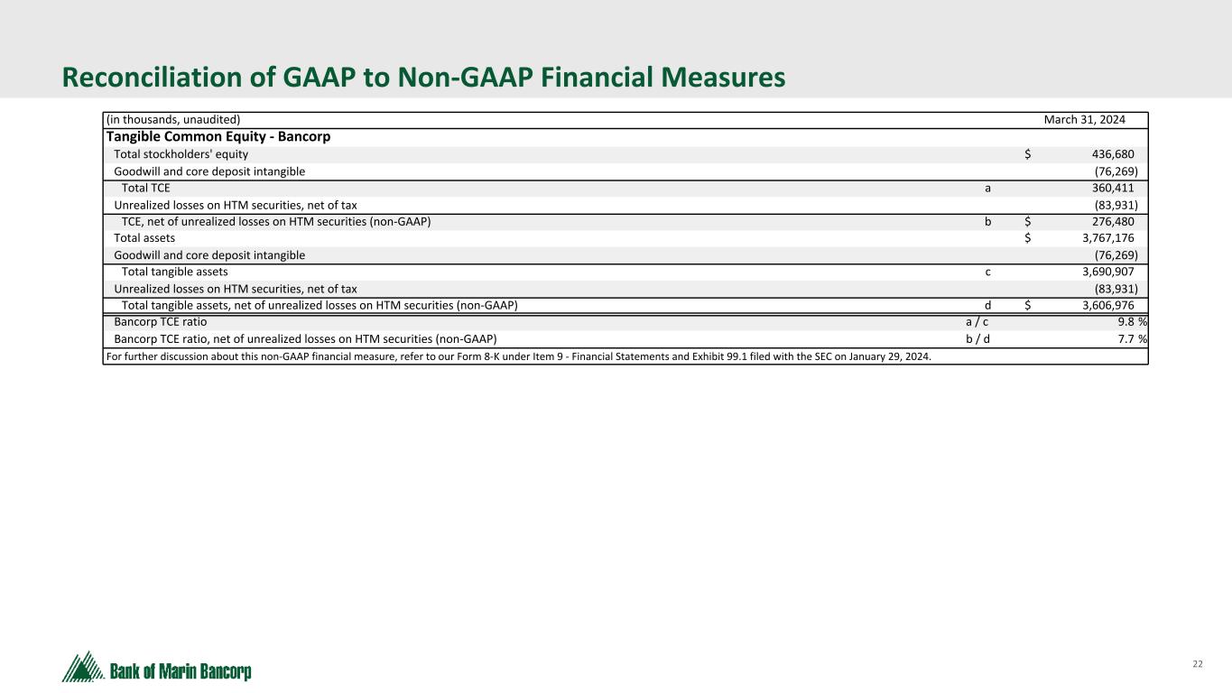 22 Text 95,96,96 Light Gray 232, 232, 232 Black 0, 0, 0 White 255, 255, 255 Accent 1 7,89,52 Accent 2 248,153,40 Accent 3 254,217,129 Accent 4 52,153,70 Accent 5 5,39,67 Accent 6 171,184,195 Reconciliation of GAAP to Non-GAAP Financial Measures (in thousands, unaudited) March 31, 2024 Tangible Common Equity - Bancorp Total stockholders' equity $ 436,680 Goodwill and core deposit intangible (76,269) Total TCE a 360,411 Unrealized losses on HTM securities, net of tax (83,931) TCE, net of unrealized losses on HTM securities (non-GAAP) b $ 276,480 Total assets $ 3,767,176 Goodwill and core deposit intangible (76,269) Total tangible assets c 3,690,907 Unrealized losses on HTM securities, net of tax (83,931) Total tangible assets, net of unrealized losses on HTM securities (non-GAAP) d $ 3,606,976 Bancorp TCE ratio a / c 9.8 % Bancorp TCE ratio, net of unrealized losses on HTM securities (non-GAAP) b / d 7.7 % For further discussion about this non-GAAP financial measure, refer to our Form 8-K under Item 9 - Financial Statements and Exhibit 99.1 filed with the SEC on January 29, 2024.