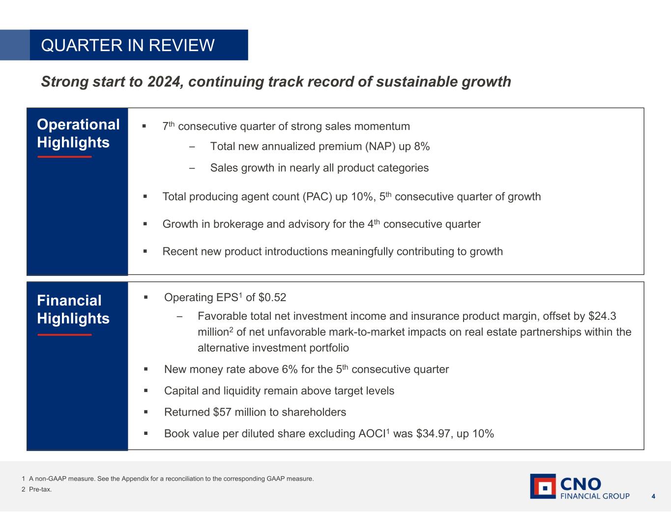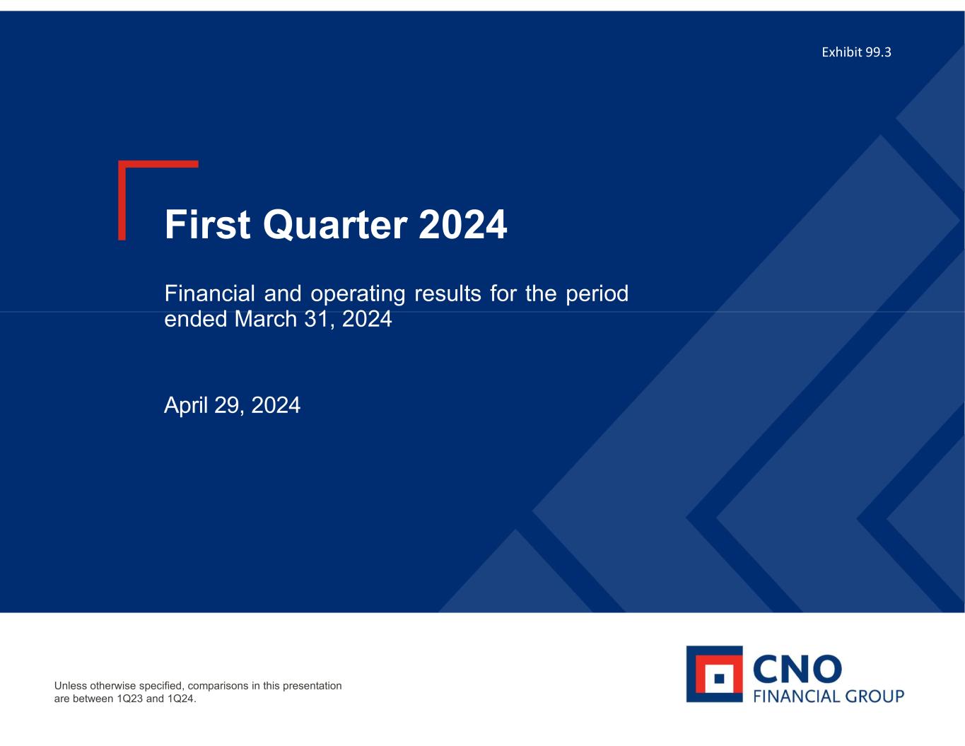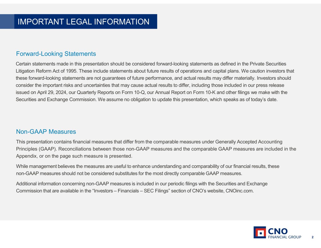 2 Certain statements made in this presentation should be considered forward-looking statements as defined in the Private Securities Litigation Reform Act of 1995. These include statements about future results of operations and capital plans. We caution investors that these forward-looking statements are not guarantees of future performance, and actual results may differ materially. Investors should consider the important risks and uncertainties that may cause actual results to differ, including those included in our press release issued on April 29, 2024, our Quarterly Reports on Form 10-Q, our Annual Report on Form 10-K and other filings we make with the Securities and Exchange Commission. We assume no obligation to update this presentation, which speaks as of today’s date. Forward-Looking Statements This presentation contains financial measures that differ from the comparable measures under Generally Accepted Accounting Principles (GAAP). Reconciliations between those non-GAAP measures and the comparable GAAP measures are included in the Appendix, or on the page such measure is presented. While management believes the measures are useful to enhance understanding and comparability of our financial results, these non-GAAP measures should not be considered substitutes for the most directly comparable GAAP measures. Additional information concerning non-GAAP measures is included in our periodic filings with the Securities and Exchange Commission that are available in the “Investors – Financials – SEC Filings” section of CNO’s website, CNOinc.com. Non-GAAP Measures IMPORTANT LEGAL INFORMATION