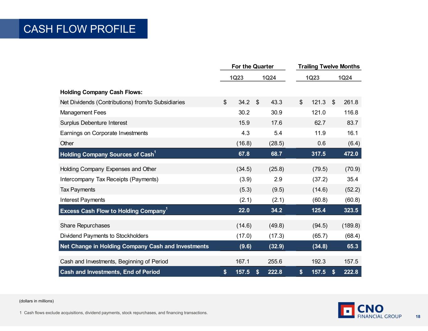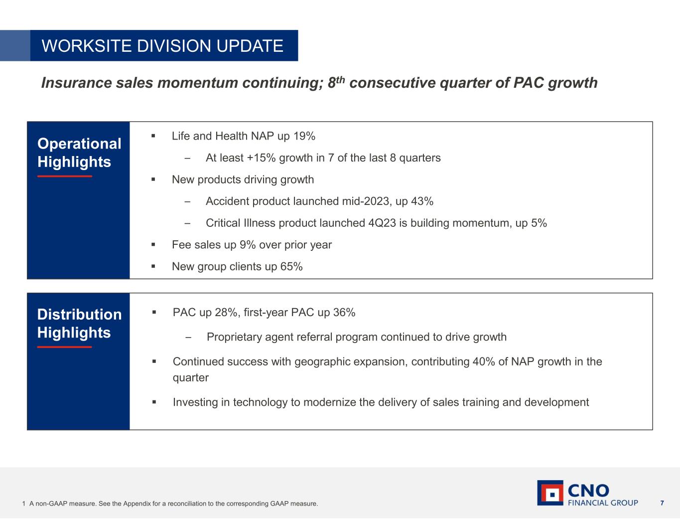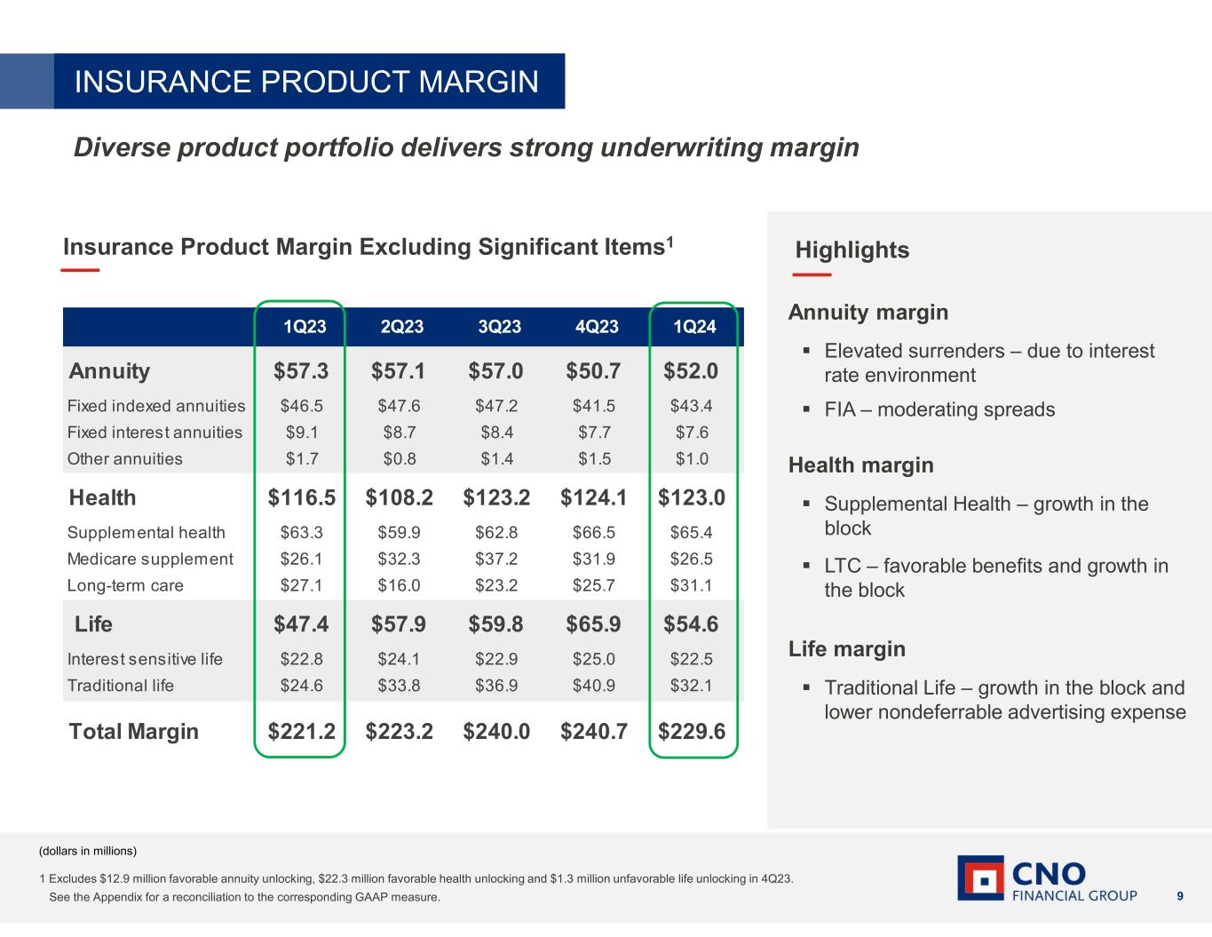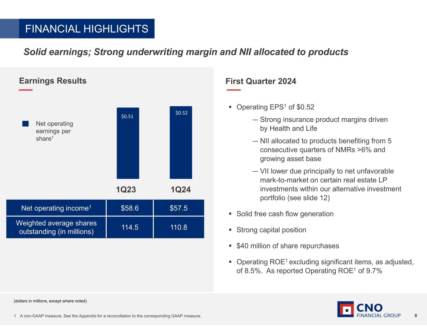 2 Certain statements made in this presentation should be considered forward-looking statements as defined in the Private Securities Litigation Reform Act of 1995. These include statements about future results of operations and capital plans. We caution investors that these forward-looking statements are not guarantees of future performance, and actual results may differ materially. Investors should consider the important risks and uncertainties that may cause actual results to differ, including those included in our press release issued on April 29, 2024, our Quarterly Reports on Form 10-Q, our Annual Report on Form 10-K and other filings we make with the Securities and Exchange Commission. We assume no obligation to update this presentation, which speaks as of today’s date. Forward-Looking Statements This presentation contains financial measures that differ from the comparable measures under Generally Accepted Accounting Principles (GAAP). Reconciliations between those non-GAAP measures and the comparable GAAP measures are included in the Appendix, or on the page such measure is presented. While management believes the measures are useful to enhance understanding and comparability of our financial results, these non-GAAP measures should not be considered substitutes for the most directly comparable GAAP measures. Additional information concerning non-GAAP measures is included in our periodic filings with the Securities and Exchange Commission that are available in the “Investors – Financials – SEC Filings” section of CNO’s website, CNOinc.com. Non-GAAP Measures IMPORTANT LEGAL INFORMATION
