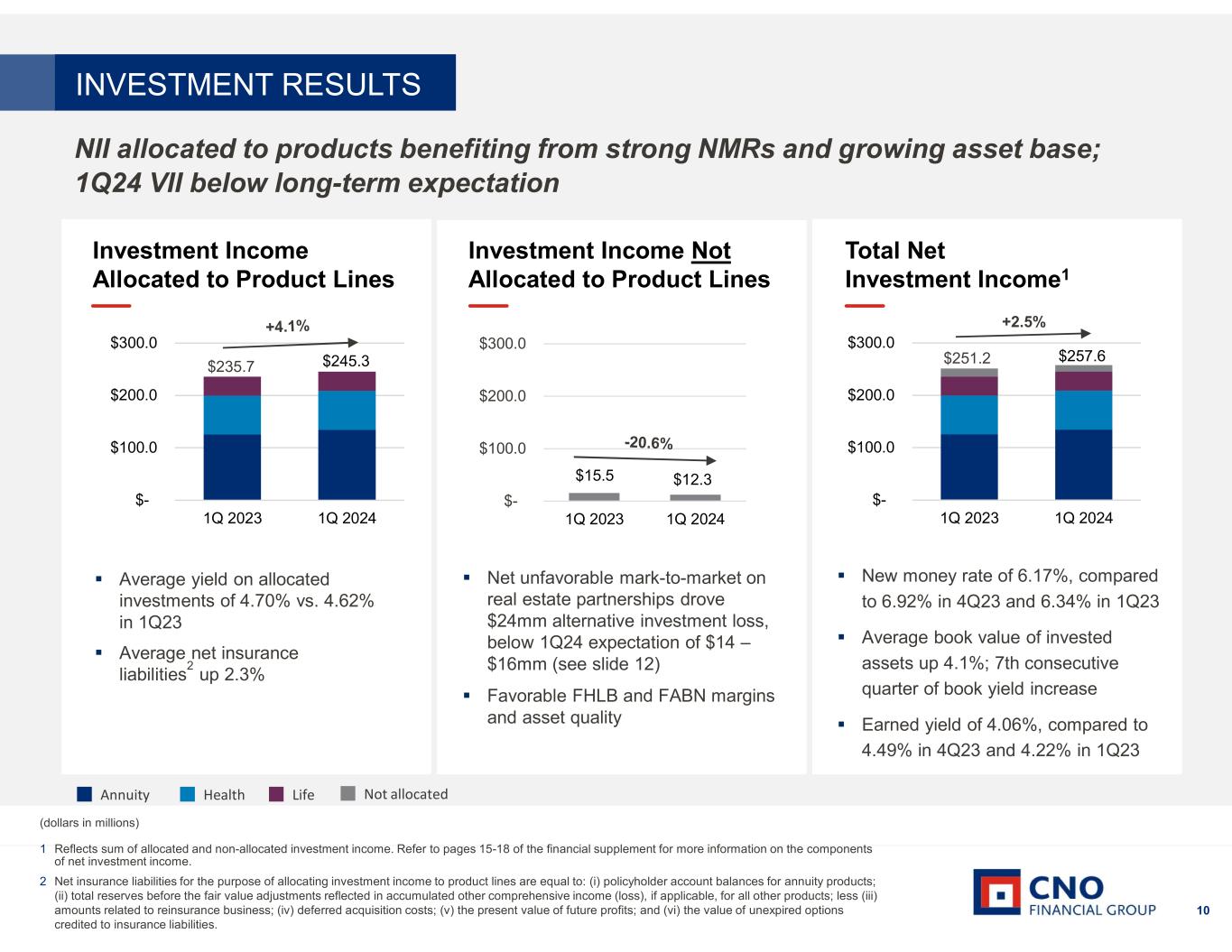 "Operating earnings benefited from growth in insurance product margins, reflecting recent sales momentum and expansion of the portfolio yield on five quarters of new money rates exceeding 6%. The only material item that offset our strong operating results in the quarter was $24.3 million of unfavorable mark-to-market pre-tax impacts on real estate partnerships within our alternative investment portfolio. These assets are delivering stable cash flows; however, the economic environment is pressuring their market values. Despite these impacts, total net investment income was up in the quarter."