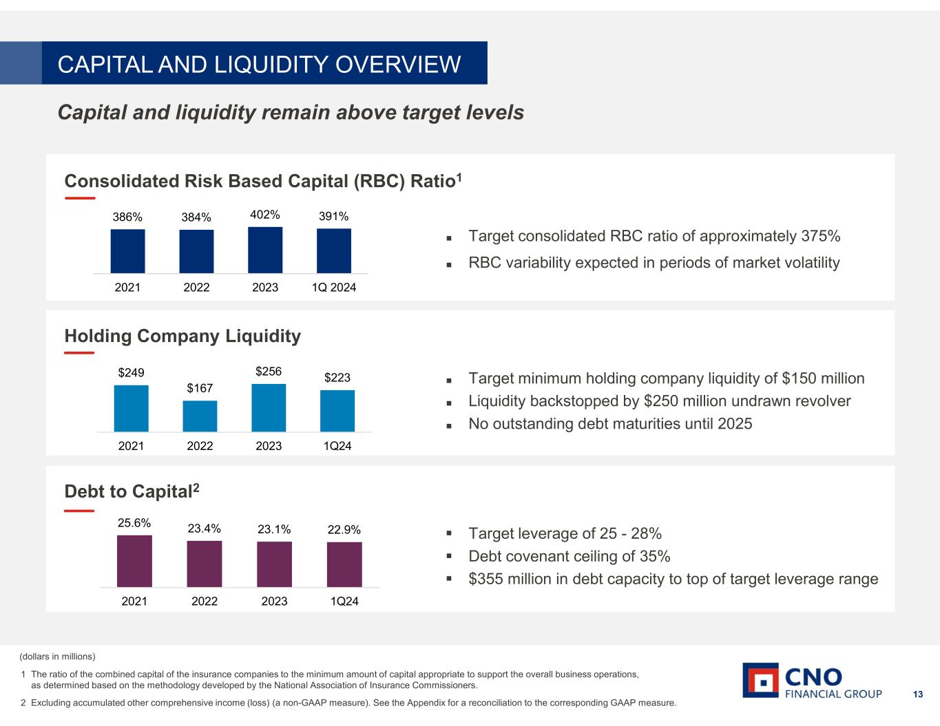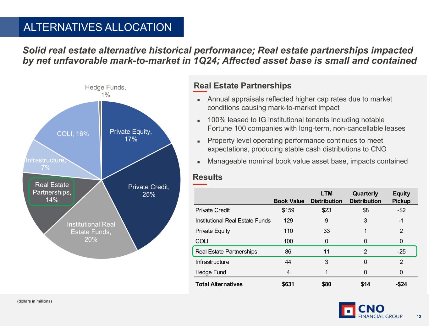12 Private Equity, 17% Private Credit, 25% Institutional Real Estate Funds, 20% Real Estate Partnerships, 14% Infrastructure, 7% COLI, 16% Hedge Funds, 1% (dollars in millions) ALTERNATIVES ALLOCATION Book Value LTM Distribution Quarterly Distribution Equity Pickup Private Credit $159 $23 $8 -$2 Institutional Real Estate Funds 129 9 3 -1 Private Equity 110 33 1 2 COLI 100 0 0 0 Real Estate Partnerships 86 11 2 -25 Infrastructure 44 3 0 2 Hedge Fund 4 1 0 0 Total Alternatives $631 $80 $14 -$24 Solid real estate alternative historical performance; Real estate partnerships impacted by net unfavorable mark-to-market in 1Q24; Affected asset base is small and contained Results Real Estate Partnerships Annual appraisals reflected higher cap rates due to market conditions causing mark-to-market impact 100% leased to IG institutional tenants including notable Fortune 100 companies with long-term, non-cancellable leases Property level operating performance continues to meet expectations, producing stable cash distributions to CNO Manageable nominal book value asset base, impacts contained
