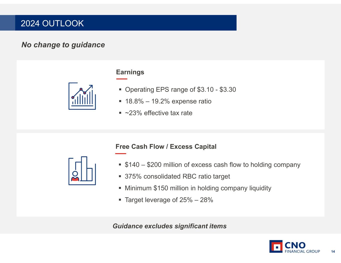 13 Debt to Capital2 Consolidated Risk Based Capital (RBC) Ratio1 Holding Company Liquidity 386% 384% 402% 391% 2021 2022 2023 1Q 2024 $249 $167 $256 $223 2021 2022 2023 1Q24 25.6% 23.4% 23.1% 22.9% 2021 2022 2023 1Q24 1 The ratio of the combined capital of the insurance companies to the minimum amount of capital appropriate to support the overall business operations, as determined based on the methodology developed by the National Association of Insurance Commissioners. 2 Excluding accumulated other comprehensive income (loss) (a non-GAAP measure). See the Appendix for a reconciliation to the corresponding GAAP measure. (dollars in millions) Target consolidated RBC ratio of approximately 375% RBC variability expected in periods of market volatility Target leverage of 25 - 28% Debt covenant ceiling of 35% $355 million in debt capacity to top of target leverage range Target minimum holding company liquidity of $150 million Liquidity backstopped by $250 million undrawn revolver No outstanding debt maturities until 2025 CAPITAL AND LIQUIDITY OVERVIEW Capital and liquidity remain above target levels