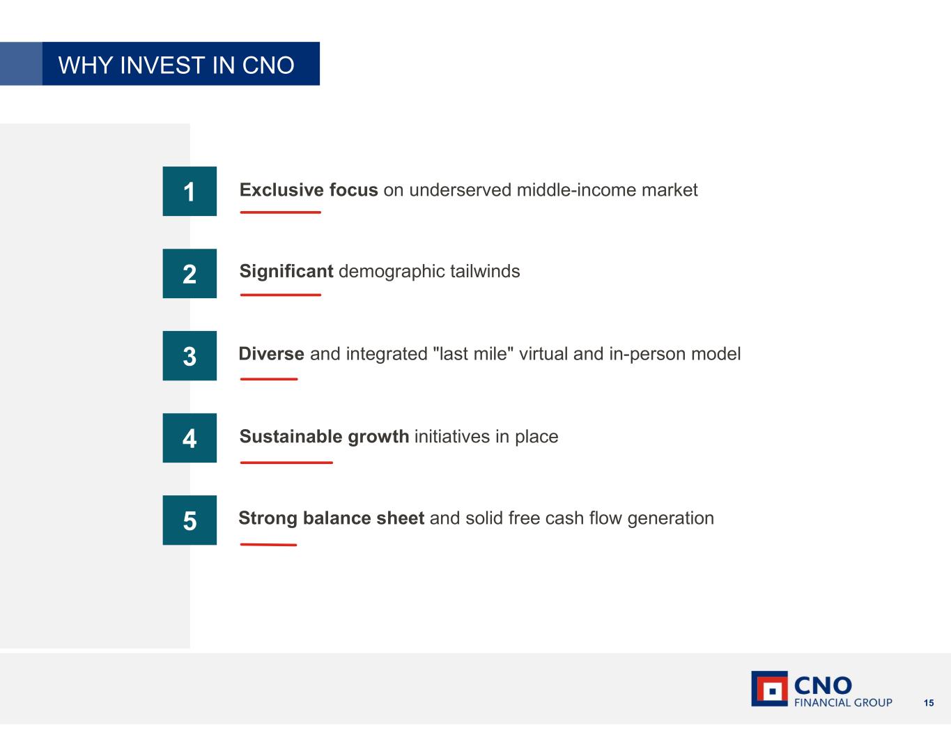 15 4 5 3 2 1 Exclusive focus on underserved middle-income market Significant demographic tailwinds Diverse and integrated "last mile" virtual and in-person model Sustainable growth initiatives in place Strong balance sheet and solid free cash flow generation WHY INVEST IN CNO