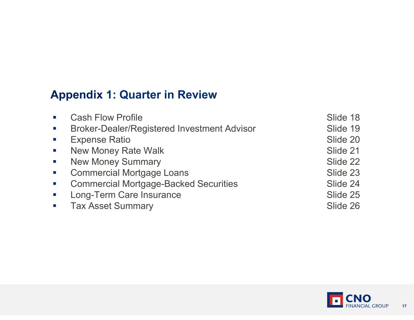 17 Cash Flow Profile Slide 18 Broker-Dealer/Registered Investment Advisor Slide 19 Expense Ratio Slide 20 New Money Rate Walk Slide 21 New Money Summary Slide 22 Commercial Mortgage Loans Slide 23 Commercial Mortgage-Backed Securities Slide 24 Long-Term Care Insurance Slide 25 Tax Asset Summary Slide 26 Appendix 1: Quarter in Review