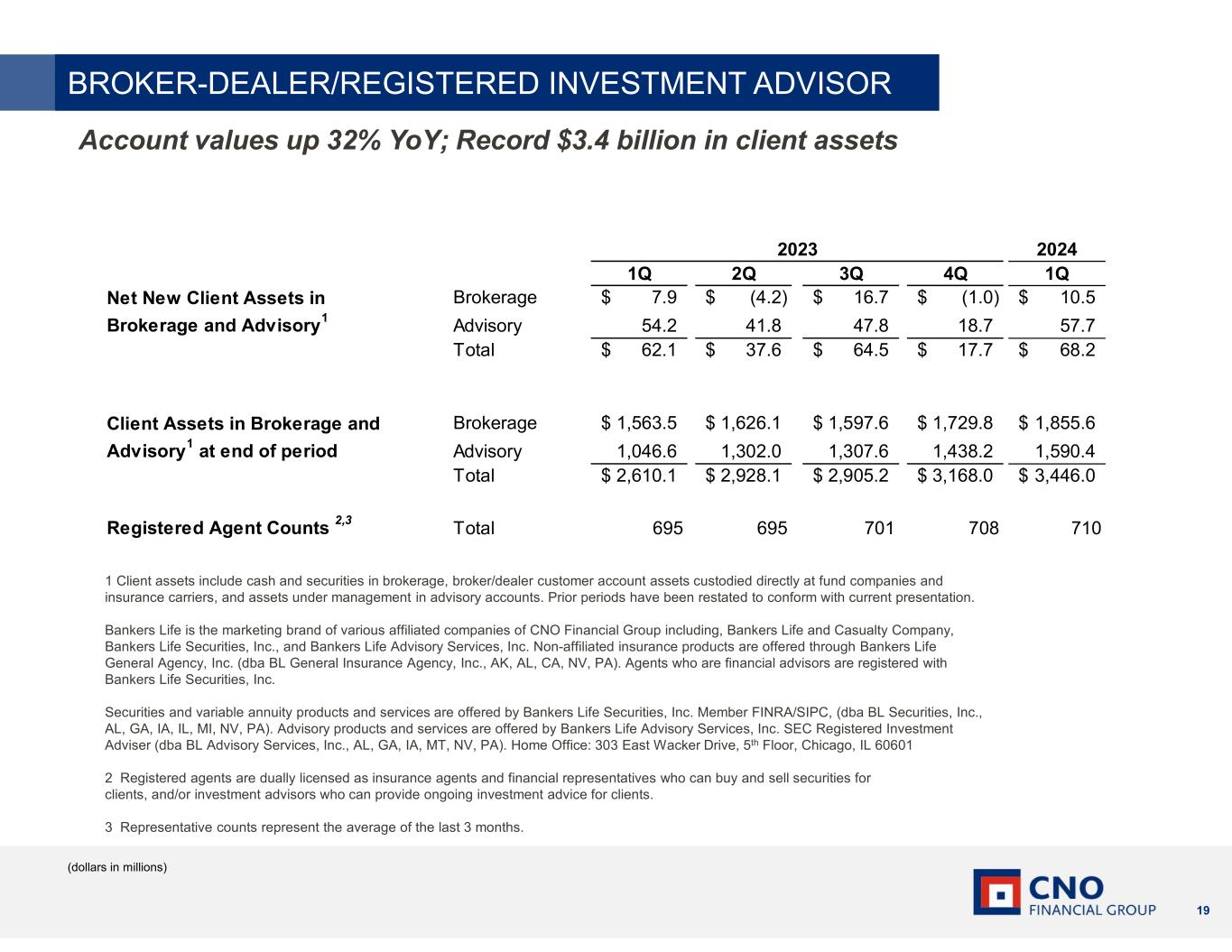 19 Account values up 32% YoY; Record $3.4 billion in client assets 1 Client assets include cash and securities in brokerage, broker/dealer customer account assets custodied directly at fund companies and insurance carriers, and assets under management in advisory accounts. Prior periods have been restated to conform with current presentation. Bankers Life is the marketing brand of various affiliated companies of CNO Financial Group including, Bankers Life and Casualty Company, Bankers Life Securities, Inc., and Bankers Life Advisory Services, Inc. Non-affiliated insurance products are offered through Bankers Life General Agency, Inc. (dba BL General Insurance Agency, Inc., AK, AL, CA, NV, PA). Agents who are financial advisors are registered with Bankers Life Securities, Inc. Securities and variable annuity products and services are offered by Bankers Life Securities, Inc. Member FINRA/SIPC, (dba BL Securities, Inc., AL, GA, IA, IL, MI, NV, PA). Advisory products and services are offered by Bankers Life Advisory Services, Inc. SEC Registered Investment Adviser (dba BL Advisory Services, Inc., AL, GA, IA, MT, NV, PA). Home Office: 303 East Wacker Drive, 5th Floor, Chicago, IL 60601 2 Registered agents are dually licensed as insurance agents and financial representatives who can buy and sell securities for clients, and/or investment advisors who can provide ongoing investment advice for clients. 3 Representative counts represent the average of the last 3 months. (dollars in millions) 2024 1Q 2Q 3Q 4Q 1Q Net New Client Assets in Brokerage 7.9$ (4.2)$ 16.7$ (1.0)$ 10.5$ Brokerage and Advisory1 Advisory 54.2 41.8 47.8 18.7 57.7 Total 62.1$ 37.6$ 64.5$ 17.7$ 68.2$ Client Assets in Brokerage and Brokerage 1,563.5$ 1,626.1$ 1,597.6$ 1,729.8$ 1,855.6$ Advisory1 at end of period Advisory 1,046.6 1,302.0 1,307.6 1,438.2 1,590.4 Total 2,610.1$ 2,928.1$ 2,905.2$ 3,168.0$ 3,446.0$ Registered Agent Counts 2,3 Total 695 695 701 708 710 2023 BROKER-DEALER/REGISTERED INVESTMENT ADVISOR