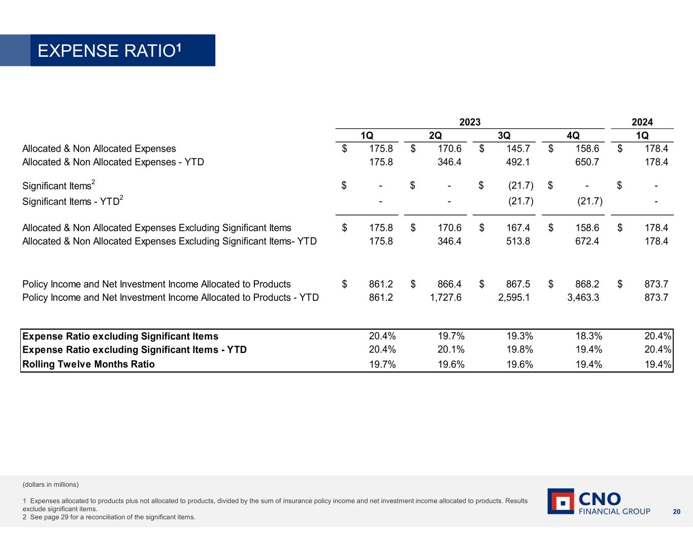 20 2024 1Q 2Q 3Q 4Q 1Q Allocated & Non Allocated Expenses 175.8$ 170.6$ 145.7$ 158.6$ 178.4$ Allocated & Non Allocated Expenses - YTD 175.8 346.4 492.1 650.7 178.4 Significant Items2 -$ -$ (21.7)$ -$ -$ Significant Items - YTD2 - - (21.7) (21.7) - Allocated & Non Allocated Expenses Excluding Significant Items 175.8$ 170.6$ 167.4$ 158.6$ 178.4$ Allocated & Non Allocated Expenses Excluding Significant Items- YTD 175.8 346.4 513.8 672.4 178.4 Policy Income and Net Investment Income Allocated to Products 861.2$ 866.4$ 867.5$ 868.2$ 873.7$ Policy Income and Net Investment Income Allocated to Products - YTD 861.2 1,727.6 2,595.1 3,463.3 873.7 Expense Ratio excluding Significant Items 20.4% 19.7% 19.3% 18.3% 20.4% Expense Ratio excluding Significant Items - YTD 20.4% 20.1% 19.8% 19.4% 20.4% Rolling Twelve Months Ratio 19.7% 19.6% 19.6% 19.4% 19.4% 2023 1 Expenses allocated to products plus not allocated to products, divided by the sum of insurance policy income and net investment income allocated to products. Results exclude significant items. 2 See page 29 for a reconciliation of the significant items. EXPENSE RATIO1 (dollars in millions)