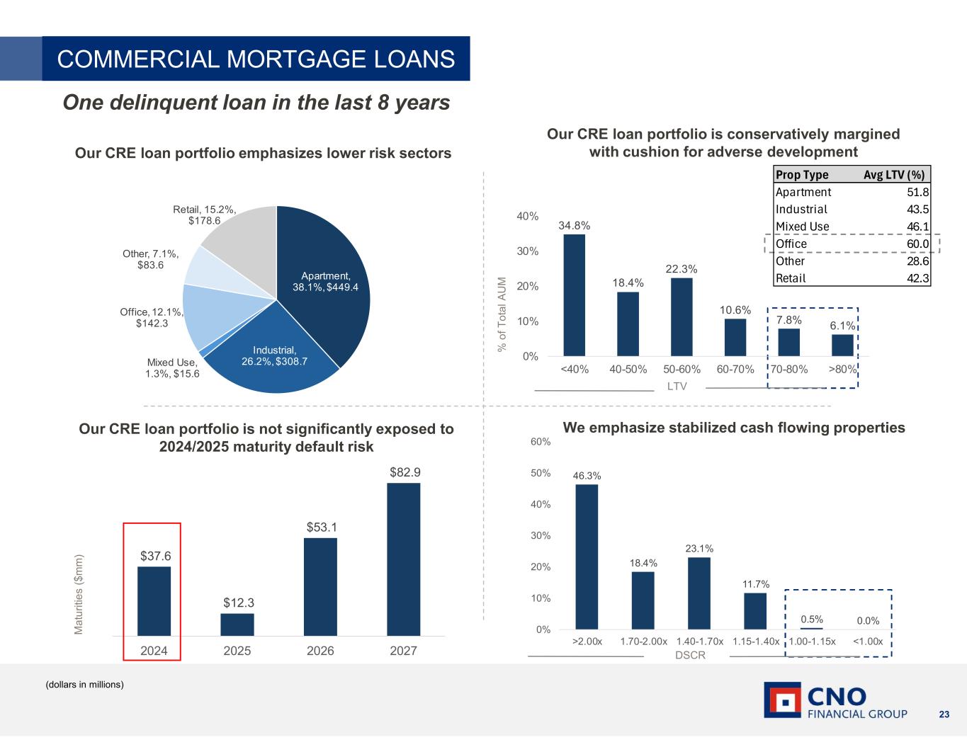 23 Our CRE loan portfolio emphasizes lower risk sectors Our CRE loan portfolio is conservatively margined with cushion for adverse development We emphasize stabilized cash flowing properties DSCR Our CRE loan portfolio is not significantly exposed to 2024/2025 maturity default risk (dollars in millions) % o f T o ta l A U M LTV COMMERCIAL MORTGAGE LOANS Apartment, 38.1%, $449.4 Industrial, 26.2%, $308.7Mixed Use, 1.3%, $15.6 Office, 12.1%, $142.3 Other, 7.1%, $83.6 Retail, 15.2%, $178.6 34.8% 18.4% 22.3% 10.6% 7.8% 6.1% 0% 10% 20% 30% 40% <40% 40-50% 50-60% 60-70% 70-80% >80% Prop Type Avg LTV (%) Apartment 51.8 Industrial 43.5 Mixed Use 46.1 Office 60.0 Other 28.6 Retail 42.3 $37.6 $12.3 $53.1 $82.9 2024 2025 2026 2027 M a tu rit ie s ($ m m ) 46.3% 18.4% 23.1% 11.7% 0.5% 0.0% 0% 10% 20% 30% 40% 50% 60% >2.00x 1.70-2.00x 1.40-1.70x 1.15-1.40x 1.00-1.15x <1.00x One delinquent loan in the last 8 years