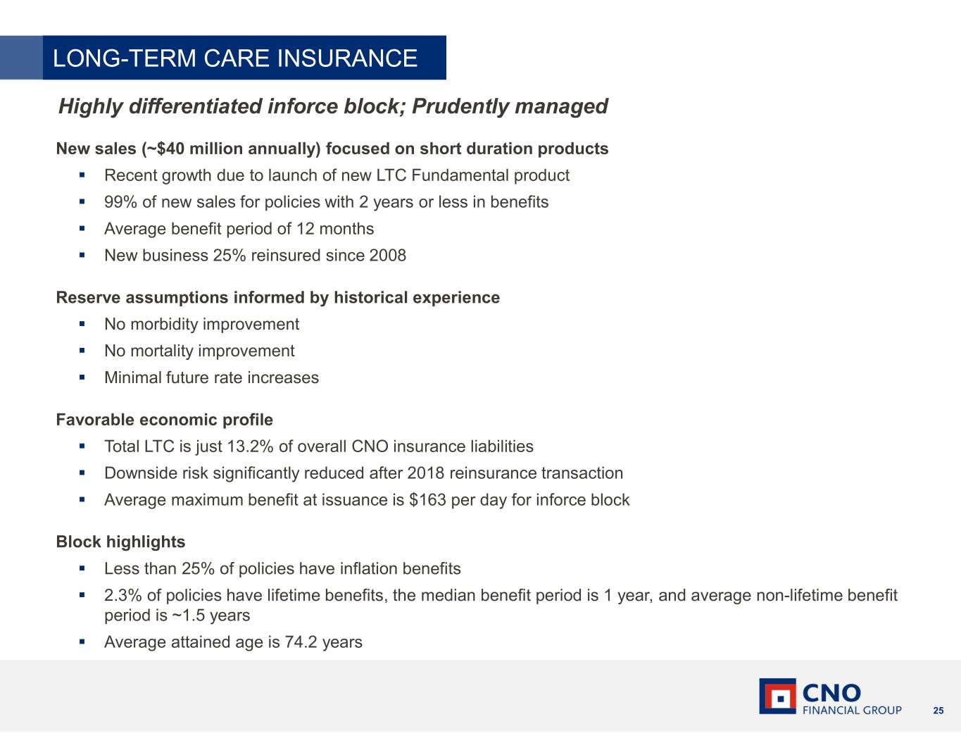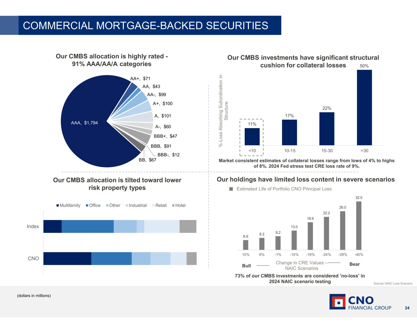 24 Source: NAIC Loss Scenario Our CMBS investments have significant structural cushion for collateral losses Our holdings have limited loss content in severe scenarios Change in CRE Values – NAIC Scenarios BearBull Estimated Life of Portfolio CNO Principal Loss Our CMBS allocation is tilted toward lower risk property types Our CMBS allocation is highly rated - 91% AAA/AA/A categories 73% of our CMBS investments are considered ‘no-loss’ in 2024 NAIC scenario testing Market consistent estimates of collateral losses range from lows of 4% to highs of 8%. 2024 Fed stress test CRE loss rate of 9%. % L o ss A b so rb in g S u b o rd in a tio n in S tr u ct u re (dollars in millions) COMMERCIAL MORTGAGE-BACKED SECURITIES AAA, $1,794 AA+, $71 AA, $43 AA-, $99 A+, $100 A, $101 A-, $60 BBB+, $47 BBB, $91 BBB-, $12 BB, $67 11% 17% 22% 50% <10 10-15 15-30 >30 CNO Index Multifamily Office Other Industrial Retail Hotel 6.6 8.2 9.2 13.0 18.6 22.2 26.0 32.5 10% 6% -1% -10% -19% -24% -29% -40%