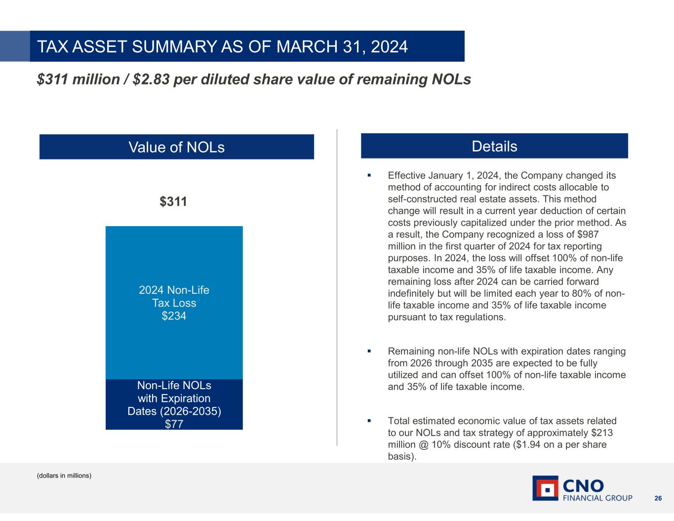 26 Value of NOLs Details Effective January 1, 2024, the Company changed its method of accounting for indirect costs allocable to self-constructed real estate assets. This method change will result in a current year deduction of certain costs previously capitalized under the prior method. As a result, the Company recognized a loss of $987 million in the first quarter of 2024 for tax reporting purposes. In 2024, the loss will offset 100% of non-life taxable income and 35% of life taxable income. Any remaining loss after 2024 can be carried forward indefinitely but will be limited each year to 80% of non- life taxable income and 35% of life taxable income pursuant to tax regulations. Remaining non-life NOLs with expiration dates ranging from 2026 through 2035 are expected to be fully utilized and can offset 100% of non-life taxable income and 35% of life taxable income. Total estimated economic value of tax assets related to our NOLs and tax strategy of approximately $213 million @ 10% discount rate ($1.94 on a per share basis). $311 (dollars in millions) $311 million / $2.83 per diluted share value of remaining NOLs Non-Life NOLs with Expiration Dates (2026-2035) $77 2024 Non-Life Tax Loss $234 TAX ASSET SUMMARY AS OF MARCH 31, 2024