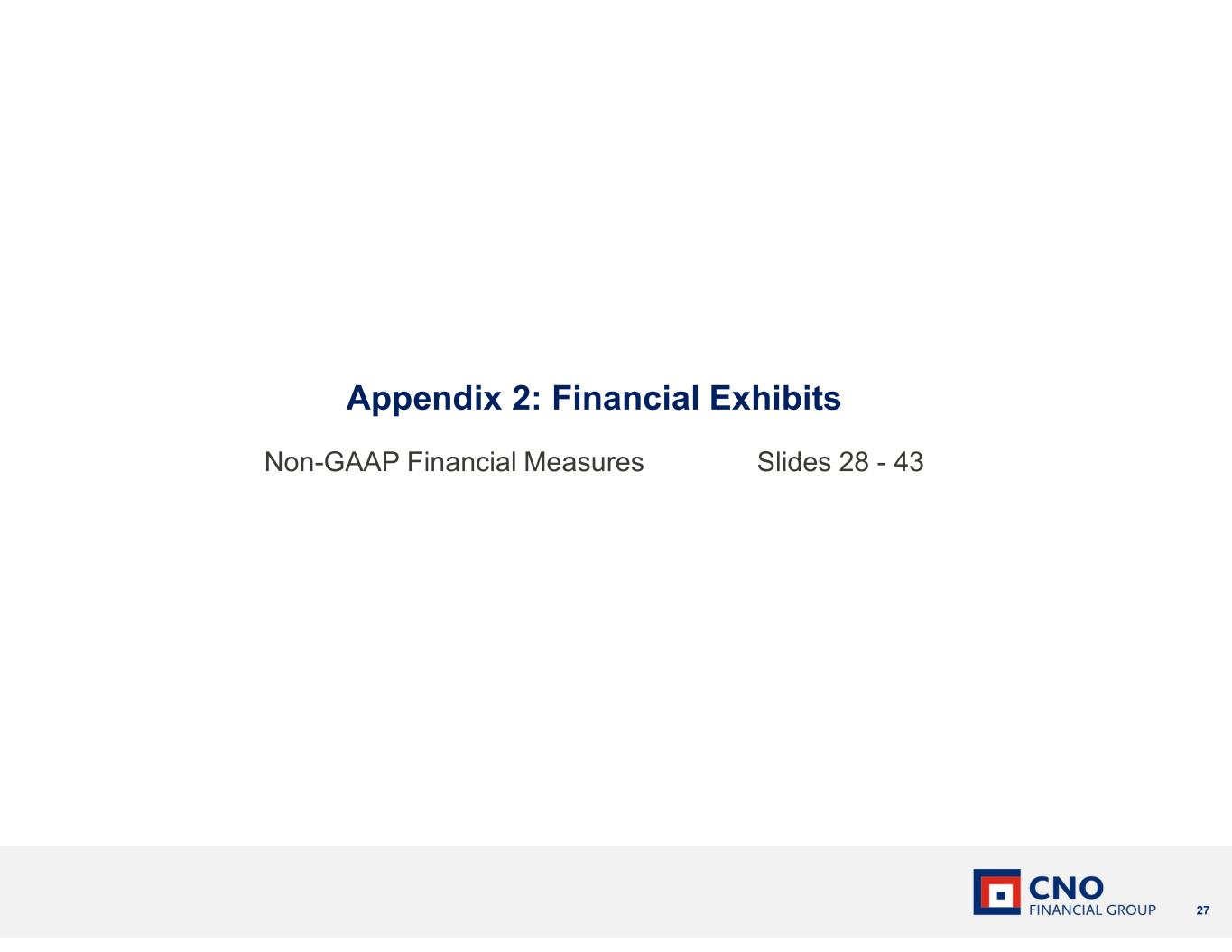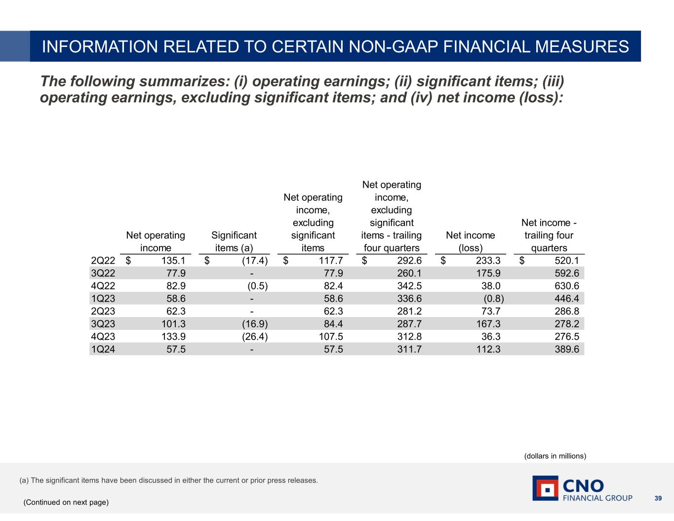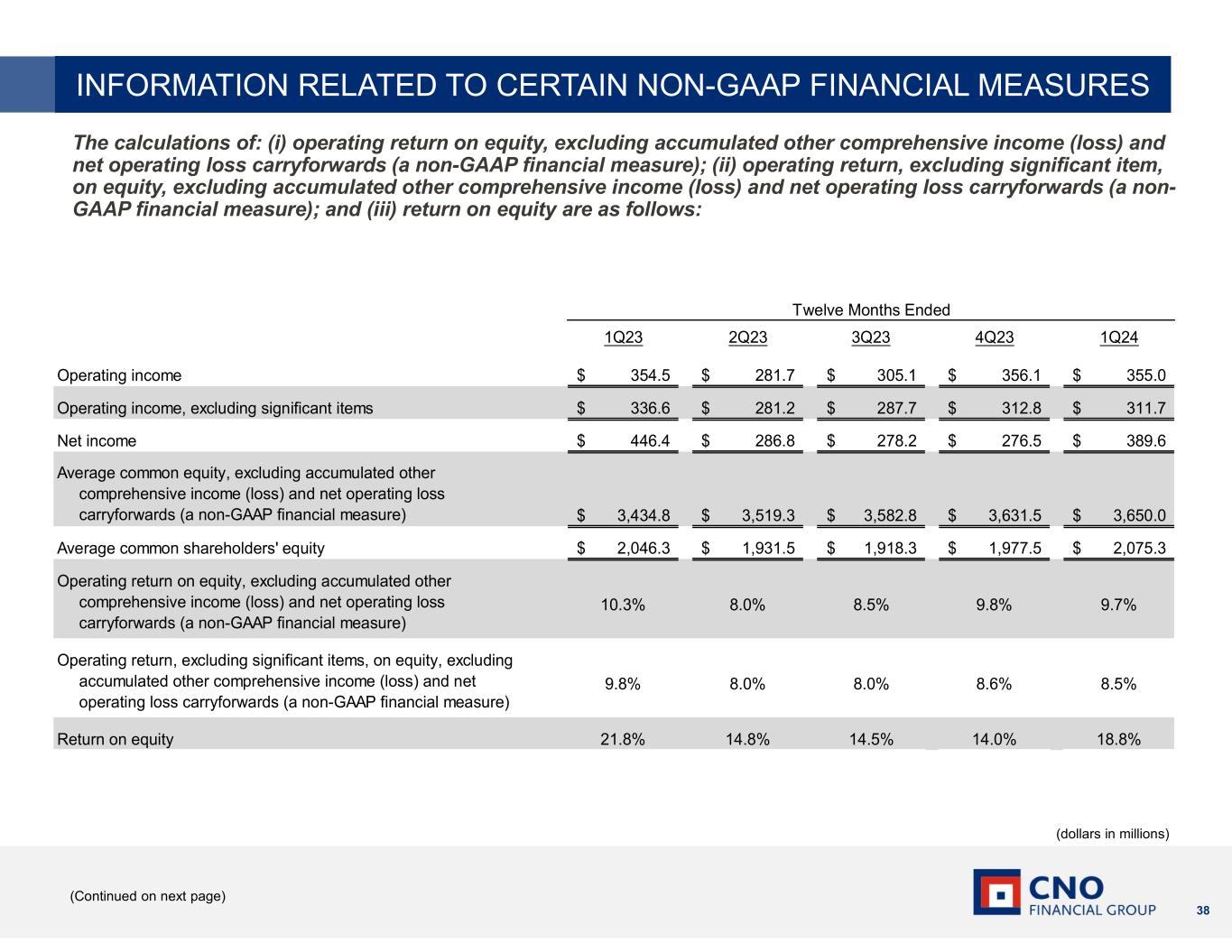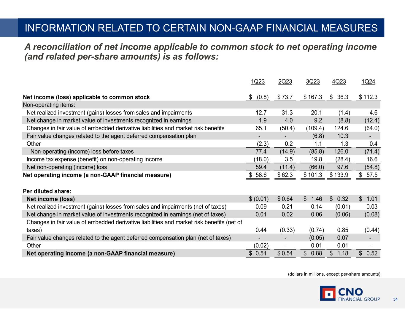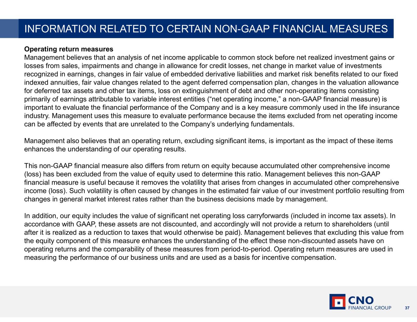 33 The following provides additional information regarding certain non-GAAP measures used in this presentation. A non-GAAP measure is a numerical measure of a company’s performance, financial position, or cash flows that excludes or includes amounts that are normally excluded or included in the most directly comparable measure calculated and presented in accordance with GAAP. While management believes these measures are useful to enhance understanding and comparability of our financial results, these non-GAAP measures should not be considered as substitutes for the most directly comparable GAAP measures. Additional information concerning non-GAAP measures is included in our periodic filings with the Securities and Exchange Commission that are available in the “Investors – SEC Filings” section of CNO’s website, www.CNOinc.com. Operating earnings measures Management believes that an analysis of net income applicable to common stock before net realized investment gains or losses from sales, impairments and change in allowance for credit losses, net change in market value of investments recognized in earnings, changes in fair value of embedded derivative liabilities and market risk benefits related to our fixed indexed annuities, fair value changes related to the agent deferred compensation plan, loss on extinguishment of debt, changes in the valuation allowance for deferred tax assets and other tax items and other non-operating items consisting primarily of earnings attributable to variable interest entities (“net operating income,” a non- GAAP financial measure) is important to evaluate the financial performance of the Company and is a key measure commonly used in the life insurance industry. Management uses this measure to evaluate performance because the items excluded from net operating income can be affected by events that are unrelated to the Company’s underlying fundamentals. INFORMATION RELATED TO CERTAIN NON-GAAP FINANCIAL MEASURES