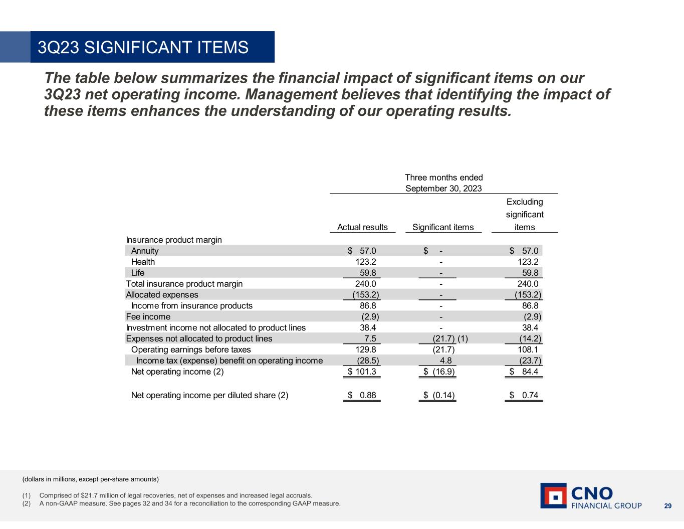 28 Insurance product margin Annuity 63.6$ (12.9)$ (1) 50.7$ Health 146.4 (22.3) (1) 124.1 Life 64.6 1.3 (1) 65.9 Total insurance product margin 274.6 (33.9) 240.7 Allocated expenses (138.8) - (138.8) Income from insurance products 135.8 (33.9) 101.9 Fee income 17.8 - 17.8 Investment income not allocated to product lines 38.3 - 38.3 Expenses not allocated to product lines (19.8) - (19.8) Operating earnings before taxes 172.1 (33.9) 138.2 Income tax (expense) benefit on operating income (38.2) 7.5 (30.7) Net operating income (2) 133.9$ (26.4)$ 107.5$ Net operating income per diluted share (2) 1.18$ 0.23$ 0.95$ Three months ended December 31, 2023 Actual results Significant items Excluding significant items (dollars in millions, except per-share amounts) (1) Impacts arising from our comprehensive annual actuarial review. (2) A non-GAAP measure. See pages 32 and 34 for a reconciliation to the corresponding GAAP measure. The table below summarizes the financial impact of significant items on our 4Q23 net operating income. Management believes that identifying the impact of these items enhances the understanding of our operating results. 4Q23 SIGNIFICANT ITEMS