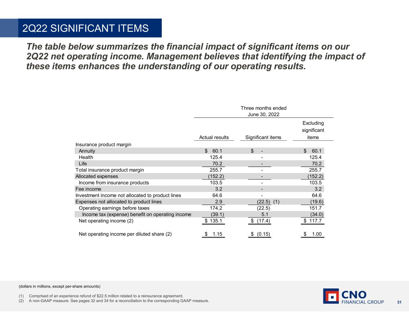 30 Insurance product margin Annuity 50.8$ 3.2$ (1) 54.0$ Health 140.4 (18.3) (1) 122.1 Life 43.3 14.4 (1) 57.7 Total insurance product margin 234.5 (0.7) 233.8 Allocated expenses (149.1) - (149.1) Income from insurance products 85.4 (0.7) 84.7 Fee income 9.2 - 9.2 Investment income not allocated to product lines 25.2 - 25.2 Expenses not allocated to product lines (12.8) (12.8) Operating earnings before taxes 107.0 (0.7) 106.3 Income tax (expense) benefit on operating income (24.1) 0.2 (23.9) Net operating income (2) 82.9$ (0.5)$ 82.4$ Net operating income per diluted share (2) 0.71$ -$ 0.71$ Three months ended December 31, 2022 Actual results Significant items Excluding significant items (dollars in millions, except per-share amounts) (1) Impacts arising from our comprehensive annual actuarial review. (2) A non-GAAP measure. See pages 32 and 34 for a reconciliation to the corresponding GAAP measure. The table below summarizes the financial impact of significant items on our 4Q22 net operating income. Management believes that identifying the impact of these items enhances the understanding of our operating results. 4Q22 SIGNIFICANT ITEMS