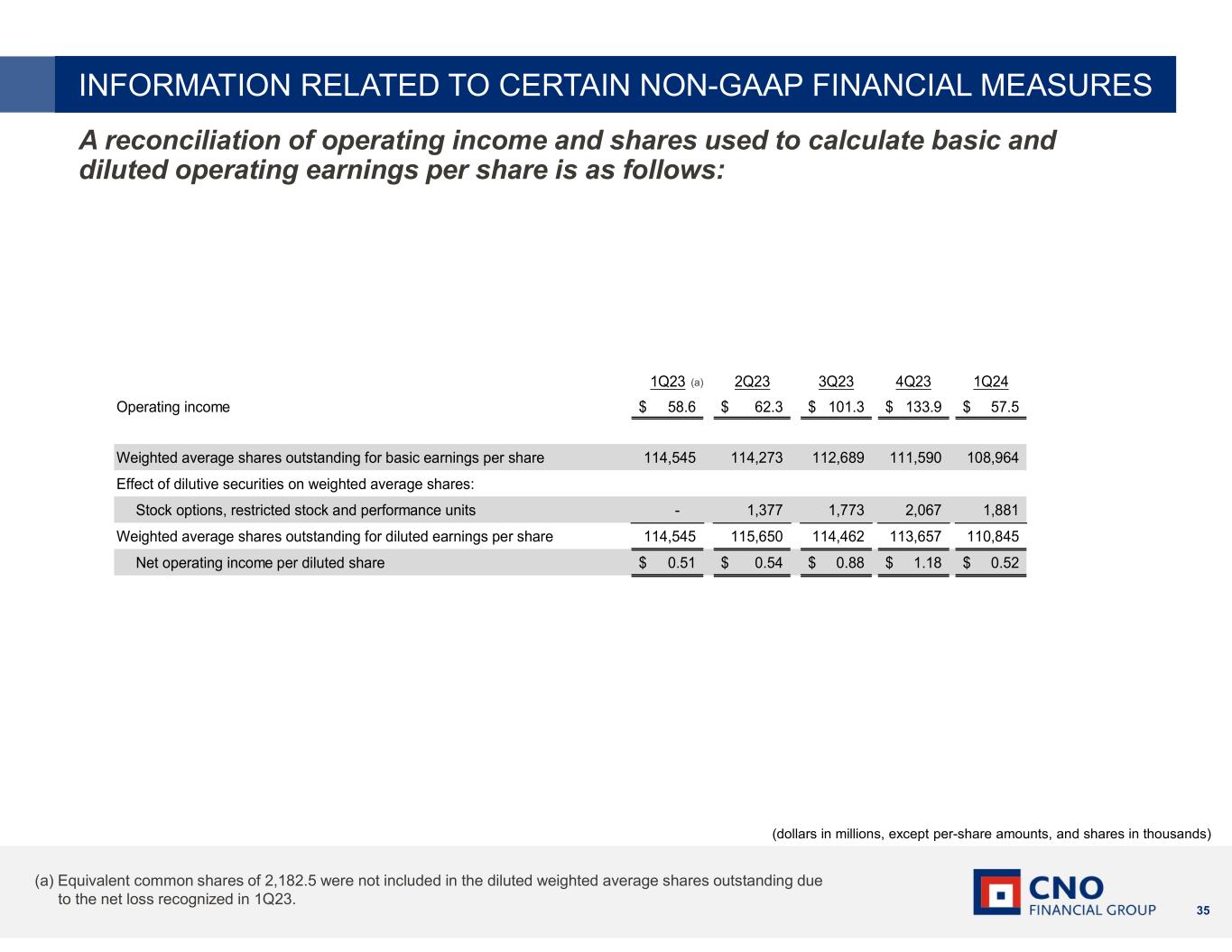 34 A reconciliation of net income applicable to common stock to net operating income (and related per-share amounts) is as follows: (dollars in millions, except per-share amounts) 1Q23 2Q23 3Q23 4Q23 1Q24 Net income (loss) applicable to common stock (0.8)$ 73.7$ 167.3$ 36.3$ 112.3$ Non-operating items: Net realized investment (gains) losses from sales and impairments 12.7 31.3 20.1 (1.4) 4.6 Net change in market value of investments recognized in earnings 1.9 4.0 9.2 (8.8) (12.4) Changes in fair value of embedded derivative liabilities and market risk benefits 65.1 (50.4) (109.4) 124.6 (64.0) Fair value changes related to the agent deferred compensation plan - - (6.8) 10.3 - Other (2.3) 0.2 1.1 1.3 0.4 Non-operating (income) loss before taxes 77.4 (14.9) (85.8) 126.0 (71.4) Income tax expense (benefit) on non-operating income (18.0) 3.5 19.8 (28.4) 16.6 Net non-operating (income) loss 59.4 (11.4) (66.0) 97.6 (54.8) Net operating income (a non-GAAP financial measure) 58.6$ 62.3$ 101.3$ 133.9$ 57.5$ Per diluted share: Net income (loss) (0.01)$ 0.64$ 1.46$ 0.32$ 1.01$ Net realized investment (gains) losses from sales and impairments (net of taxes) 0.09 0.21 0.14 (0.01) 0.03 Net change in market value of investments recognized in earnings (net of taxes) 0.01 0.02 0.06 (0.06) (0.08) Changes in fair value of embedded derivative liabilities and market risk benefits (net of taxes) 0.44 (0.33) (0.74) 0.85 (0.44) Fair value changes related to the agent deferred compensation plan (net of taxes) - - (0.05) 0.07 - Other (0.02) - 0.01 0.01 - Net operating income (a non-GAAP financial measure) 0.51$ 0.54$ 0.88$ 1.18$ 0.52$ INFORMATION RELATED TO CERTAIN NON-GAAP FINANCIAL MEASURES