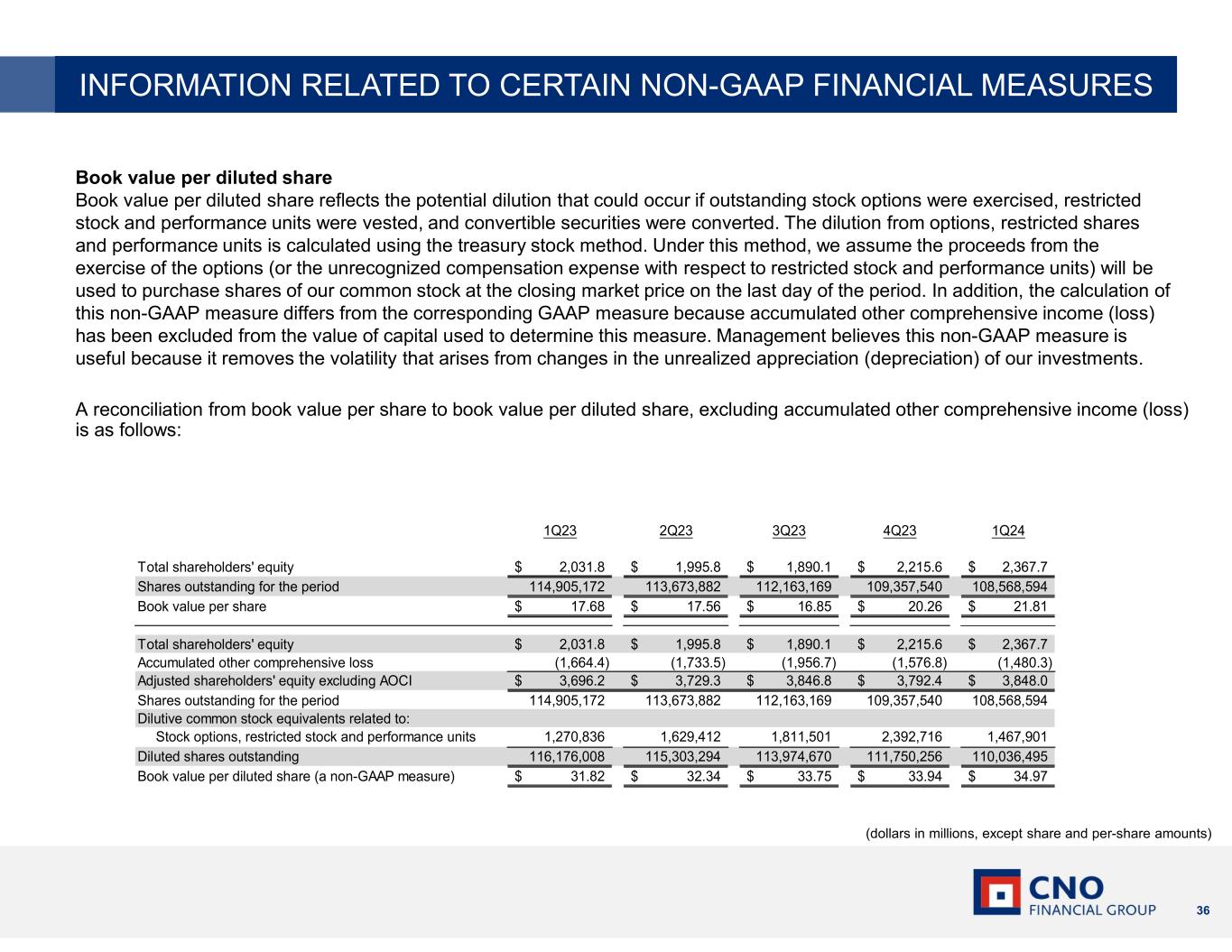 36 Book value per diluted share Book value per diluted share reflects the potential dilution that could occur if outstanding stock options were exercised, restricted stock and performance units were vested, and convertible securities were converted. The dilution from options, restricted shares and performance units is calculated using the treasury stock method. Under this method, we assume the proceeds from the exercise of the options (or the unrecognized compensation expense with respect to restricted stock and performance units) will be used to purchase shares of our common stock at the closing market price on the last day of the period. In addition, the calculation of this non-GAAP measure differs from the corresponding GAAP measure because accumulated other comprehensive income (loss) has been excluded from the value of capital used to determine this measure. Management believes this non-GAAP measure is useful because it removes the volatility that arises from changes in the unrealized appreciation (depreciation) of our investments. A reconciliation from book value per share to book value per diluted share, excluding accumulated other comprehensive income (loss) is as follows: (dollars in millions, except share and per-share amounts) 1Q23 2Q23 3Q23 4Q23 1Q24 Total shareholders' equity 2,031.8$ 1,995.8$ 1,890.1$ 2,215.6$ 2,367.7$ Shares outstanding for the period 114,905,172 113,673,882 112,163,169 109,357,540 108,568,594 Book value per share 17.68$ 17.56$ 16.85$ 20.26$ 21.81$ Total shareholders' equity 2,031.8$ 1,995.8$ 1,890.1$ 2,215.6$ 2,367.7$ Accumulated other comprehensive loss (1,664.4) (1,733.5) (1,956.7) (1,576.8) (1,480.3) Adjusted shareholders' equity excluding AOCI 3,696.2$ 3,729.3$ 3,846.8$ 3,792.4$ 3,848.0$ Shares outstanding for the period 114,905,172 113,673,882 112,163,169 109,357,540 108,568,594 Dilutive common stock equivalents related to: Stock options, restricted stock and performance units 1,270,836 1,629,412 1,811,501 2,392,716 1,467,901 Diluted shares outstanding 116,176,008 115,303,294 113,974,670 111,750,256 110,036,495 Book value per diluted share (a non-GAAP measure) 31.82$ 32.34$ 33.75$ 33.94$ 34.97$ INFORMATION RELATED TO CERTAIN NON-GAAP FINANCIAL MEASURES