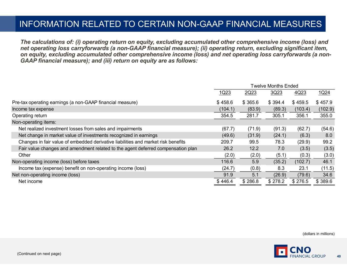 40 The calculations of: (i) operating return on equity, excluding accumulated other comprehensive income (loss) and net operating loss carryforwards (a non-GAAP financial measure); (ii) operating return, excluding significant item, on equity, excluding accumulated other comprehensive income (loss) and net operating loss carryforwards (a non- GAAP financial measure); and (iii) return on equity are as follows: (dollars in millions) (Continued on next page) 1Q23 2Q23 3Q23 4Q23 1Q24 Pre-tax operating earnings (a non-GAAP financial measure) 458.6$ 365.6$ 394.4$ 459.5$ 457.9$ Income tax expense (104.1) (83.9) (89.3) (103.4) (102.9) Operating return 354.5 281.7 305.1 356.1 355.0 Non-operating items: Net realized investment losses from sales and impairments (67.7) (71.9) (91.3) (62.7) (54.6) Net change in market value of investments recognized in earnings (49.6) (31.9) (24.1) (6.3) 8.0 Changes in fair value of embedded derivative liabilities and market risk benefits 209.7 99.5 78.3 (29.9) 99.2 Fair value changes and amendment related to the agent deferred compensation plan 26.2 12.2 7.0 (3.5) (3.5) Other (2.0) (2.0) (5.1) (0.3) (3.0) Non-operating income (loss) before taxes 116.6 5.9 (35.2) (102.7) 46.1 Income tax (expense) benefit on non-operating income (loss) (24.7) (0.8) 8.3 23.1 (11.5) Net non-operating income (loss) 91.9 5.1 (26.9) (79.6) 34.6 Net income 446.4$ 286.8$ 278.2$ 276.5$ 389.6$ Twelve Months Ended INFORMATION RELATED TO CERTAIN NON-GAAP FINANCIAL MEASURES